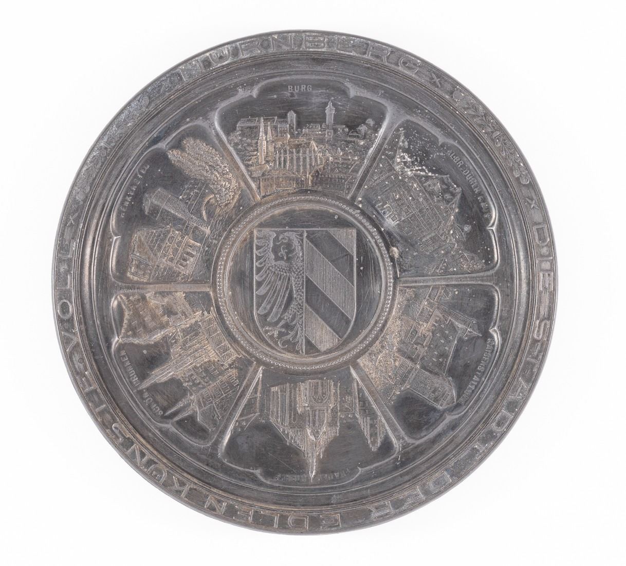 Souvenir plate from the Nuremberg Reichs Party Day rally with vignettes of Nuremberg's famous historical buildings around the outer edge with the words 'Nurnberg die Stadt der Edlen Kunste Voll' (Nuremberg the City of Noble Arts) with the coat of arms of Nuremberg in the center. The six panels show the Imperial Castle of Nuremberg, the Albrecht Durer House, the Kaiserstallung, Our Lady's Church, the fountain on the Hauptmarkt or Adolf Hitler Square, and the Henkersteg. A small hanger is attached to the back. Approx. 9 inches in diameter. Nice display piece.