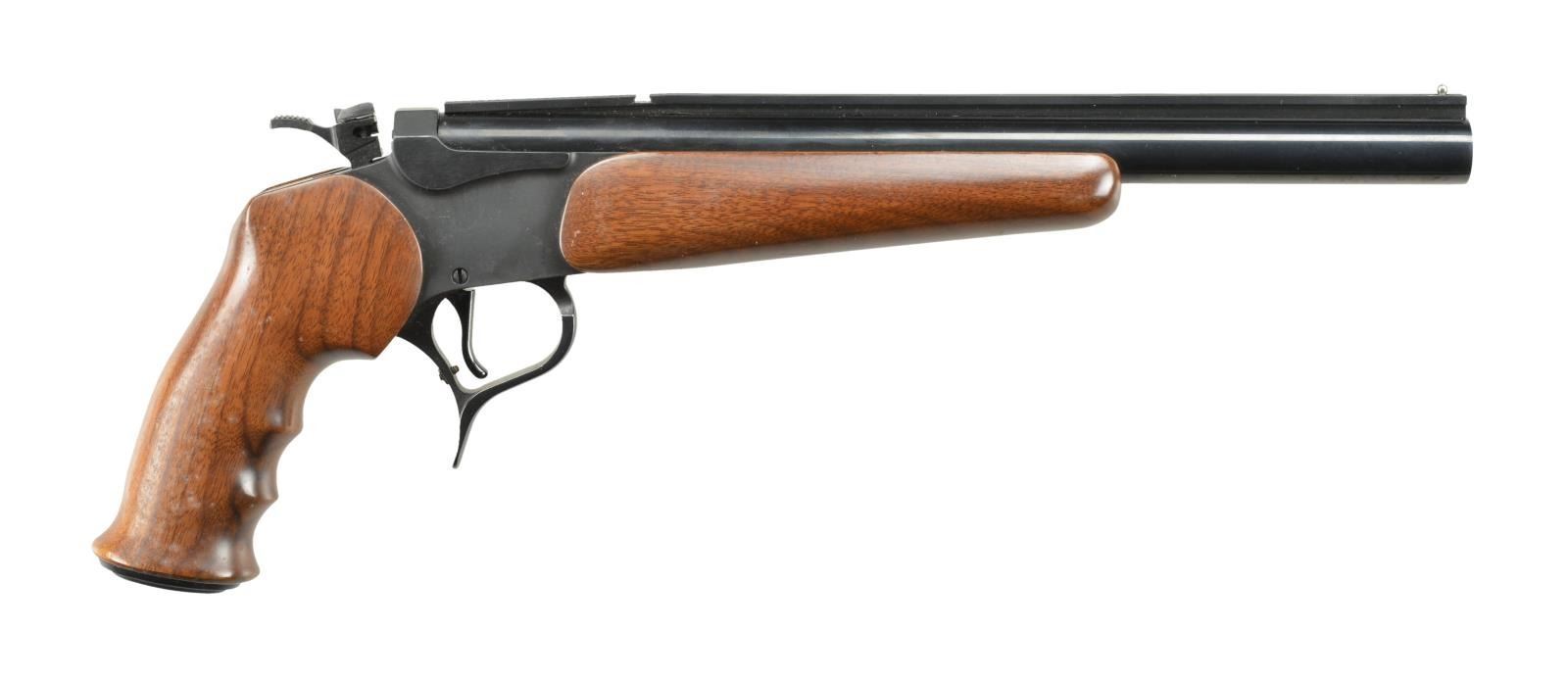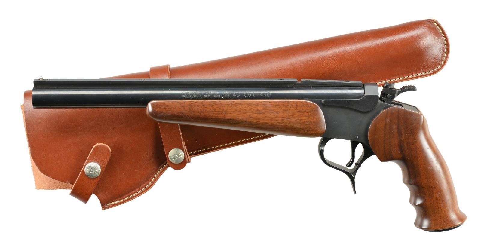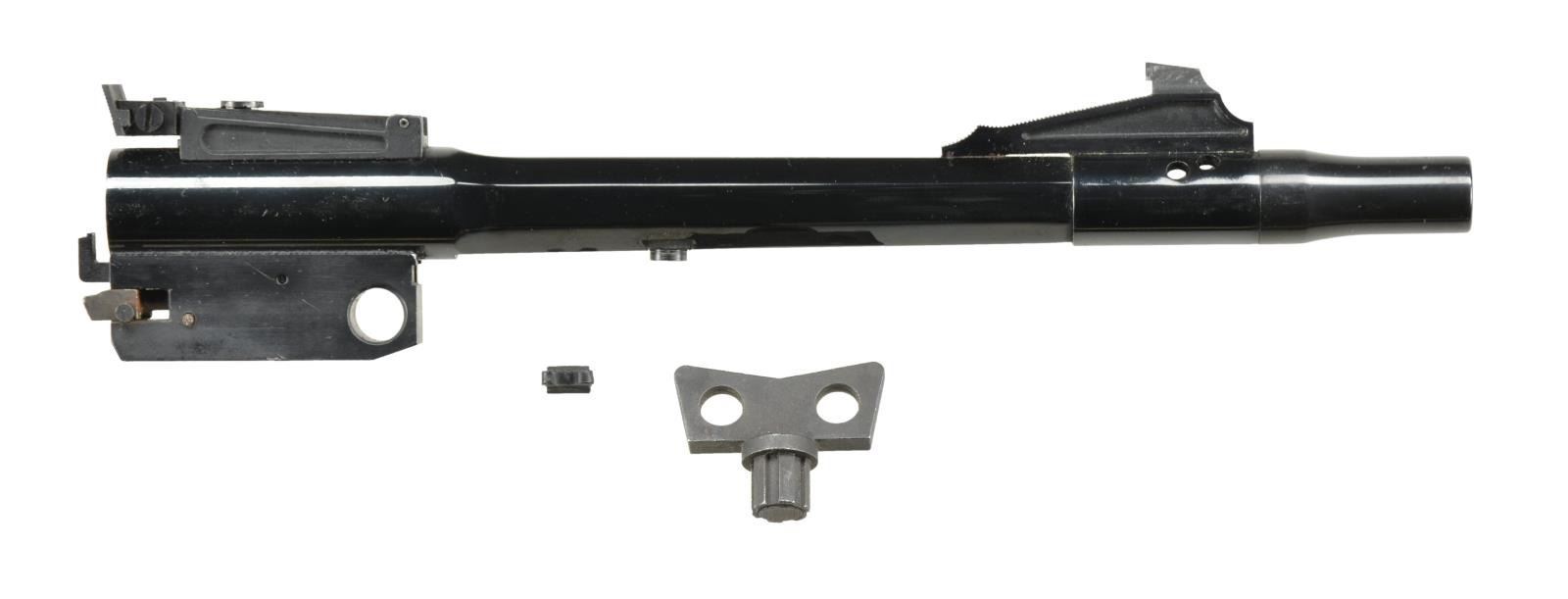 Cal. 45 Colt / 410 Ga. S# G15538. Bbl. 12" w/ rib having bright bead & sm. rear dovetail for sight. Rifled bore w/ full choke at muzzle. Blue finish easy open frame. Selector on hammer. Walnut stocks. UNATTACHED ACCESSORIES: Hunter "65-976 / 1332" holster in very good condition w/ takedown screwdriver & rear sight. 9.5" 44 Mag. bbl. w/ threaded adapter, ported muzzle, ramp mounted blade front sight & adj. rear sight. Very good condition. CONDITION: Very good overall w/ light marks & few spots of oxidation. Very good bore. (22-1895/MD). MODERN. $350-500.