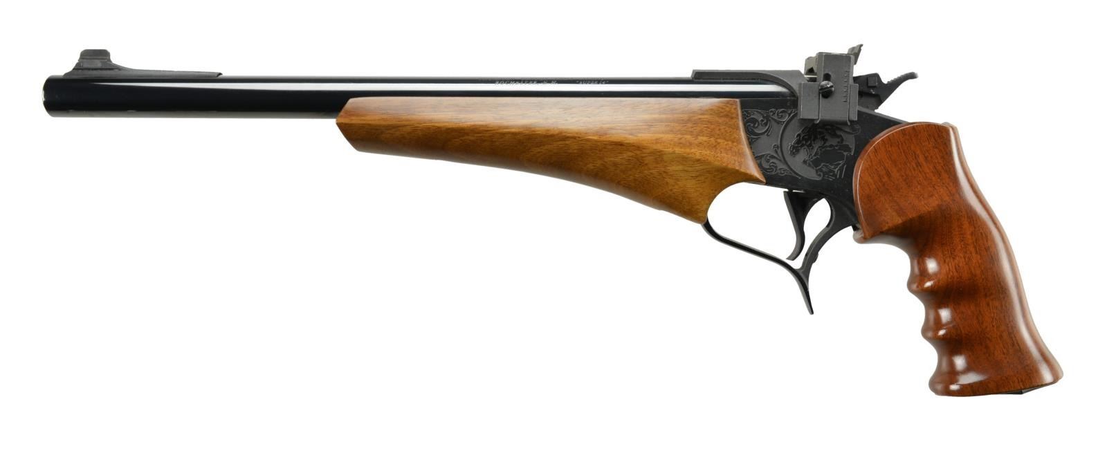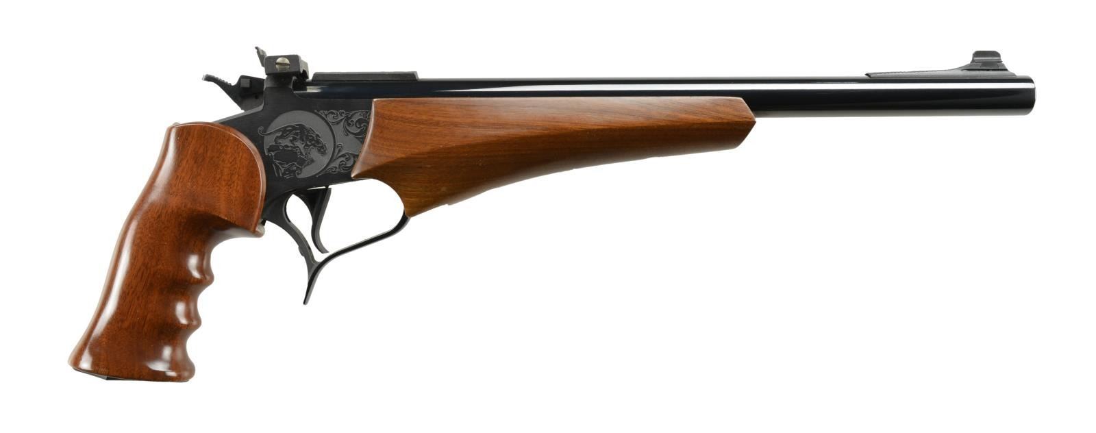 Cal. 44 Mag. S# 131902. Bbl. 14". Deep blued finish on bull bbl. w/ matte finish receiver bearing factory mountain lion engraving. Matching hardwood grip & beavertail forearm. Single shot. Serrated skeletonized hammer spur. Ramped front blade & adj. rear target sight. UNATTACHED ACCESSORIES: leather Ace gun rug. CONDITION: all aspects indicate very little use. Finish on exposed metal surfaces free of any noticeable blemishing. Wooden stocks host only a few gentle impressions on right side forward of trigger guard. Bore is shiny w/ aggressive rifling. (22-175/JZ). MODERN. $400-550.