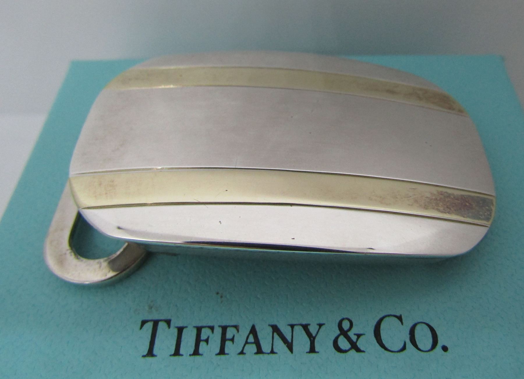 ALL GENUINE SIGNED " TIFFANY & CO. 18KT & STERLING". MEASURES 51MM BY 32MM. WEIGHS 26.7 GRAMS. HOLDS A 1 INCH BELT. IN A TIFFANY BOX. USA SHIPPING $8.