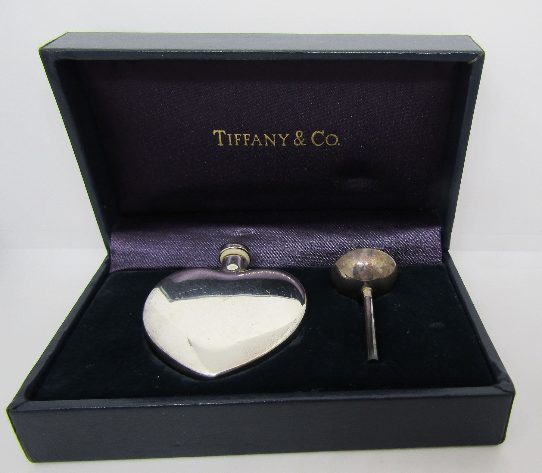 BOTH PIECES GENUINE SIGNED "TIFFANY & CO. STERLING" SCENT CONTAINER PLUS 32MM FUNNEL. MEASURES 42MM BY 43MM. WEIGHS 21.1 GRAMS. IN TIFFANY BOX. EXCELLENT CONDITION VINTAGE ESTATE GEM. USA SHIPPING $8.