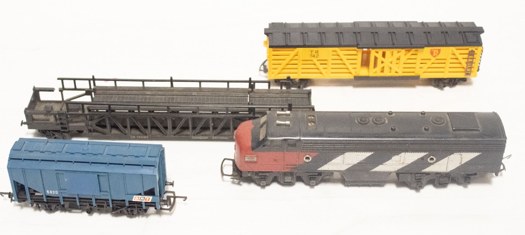 WAGON, YELLOW STOCK CAR AND AUTO TRANSPORTER ALL TRI-ANG HORNBY 4 LOT