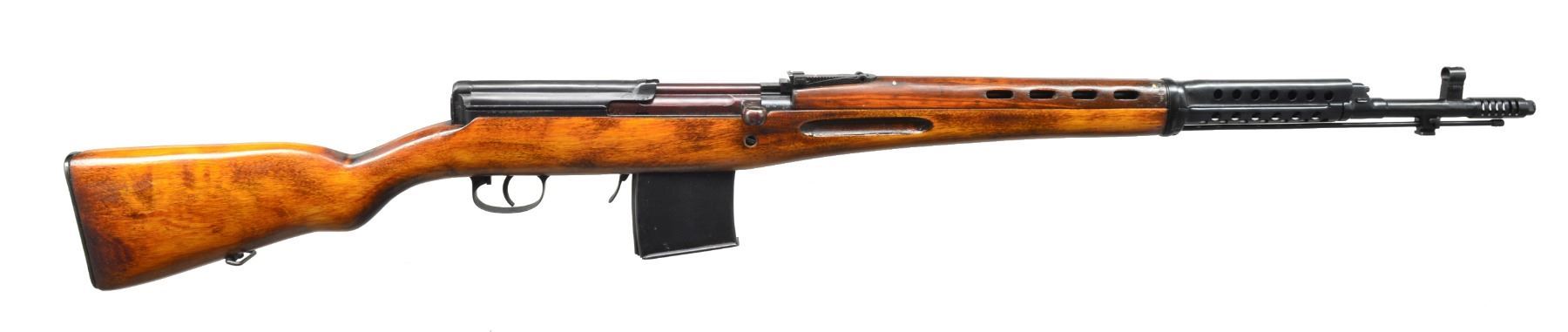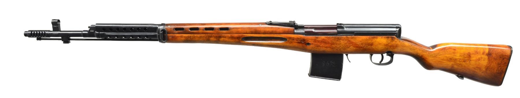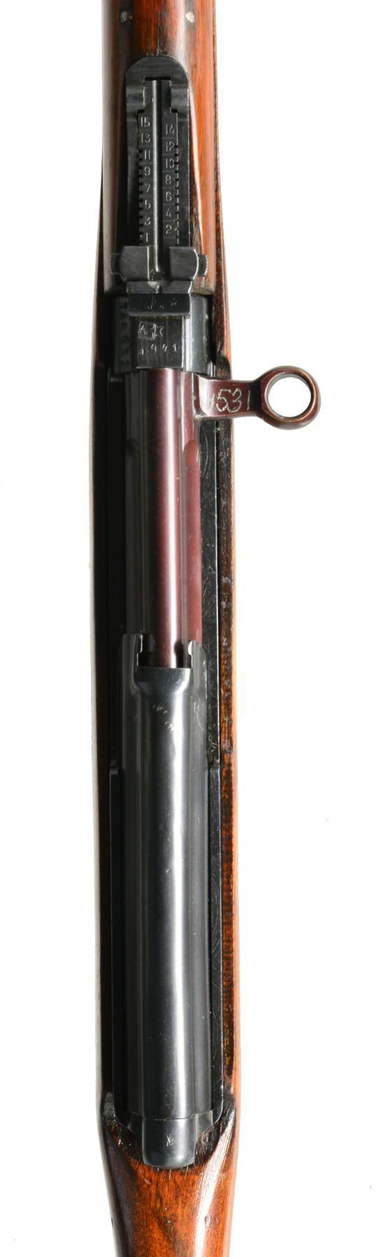 Cal. 7.62x54R. S# TA4531. Bbl. 26 7/8". Import marked on right side of receiver. Receiver marked over chamber w/ star, boxed arsenal rebuild mark & "1941". Tangent rear sight graduated to 1,500m. Post front sight w/ hood. Bbl. includes flash suppressor. Cleaning rod & bayonet lug are present. Hardwood stock set w/ ventilated handguard. MAGS: 1-10 rd. w/ mismatched electro pencil number. CONDITION: stock & metal have high degree of arsenal rework finish w/ light wear & handling marks. Bolt is notable plum color. Fair worn bore turning dark in grooves. (20-227/RW). CURIO. $600-900.