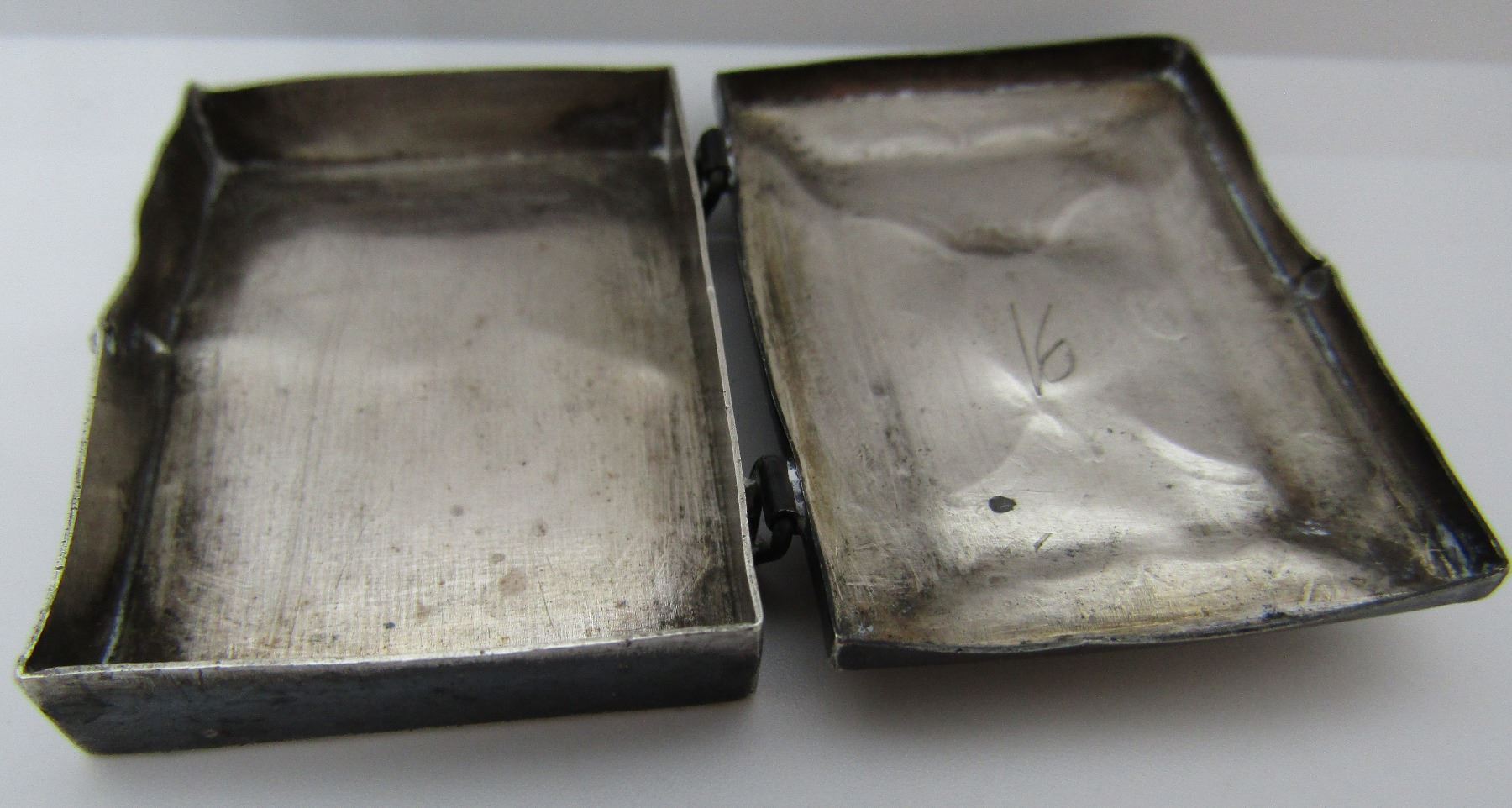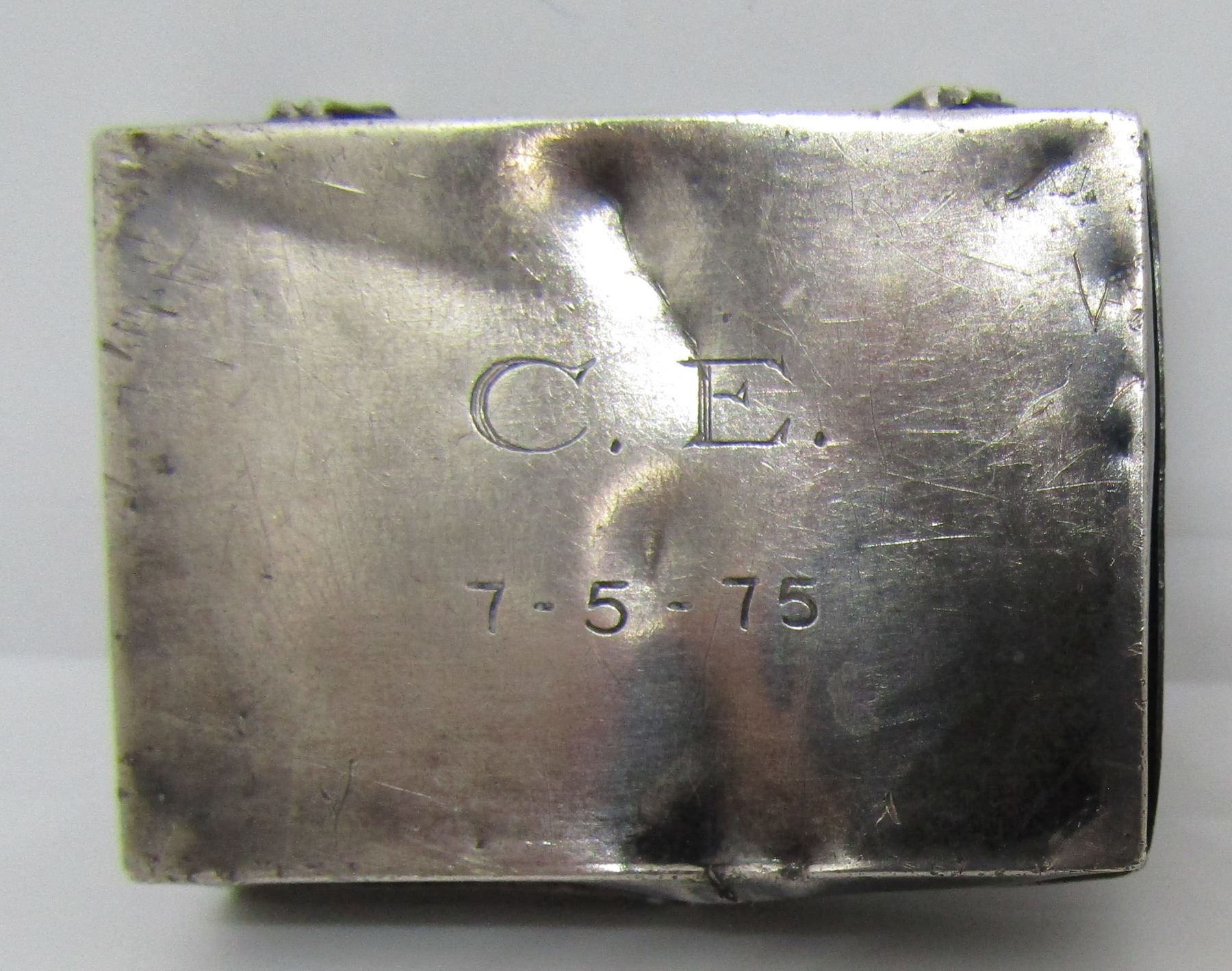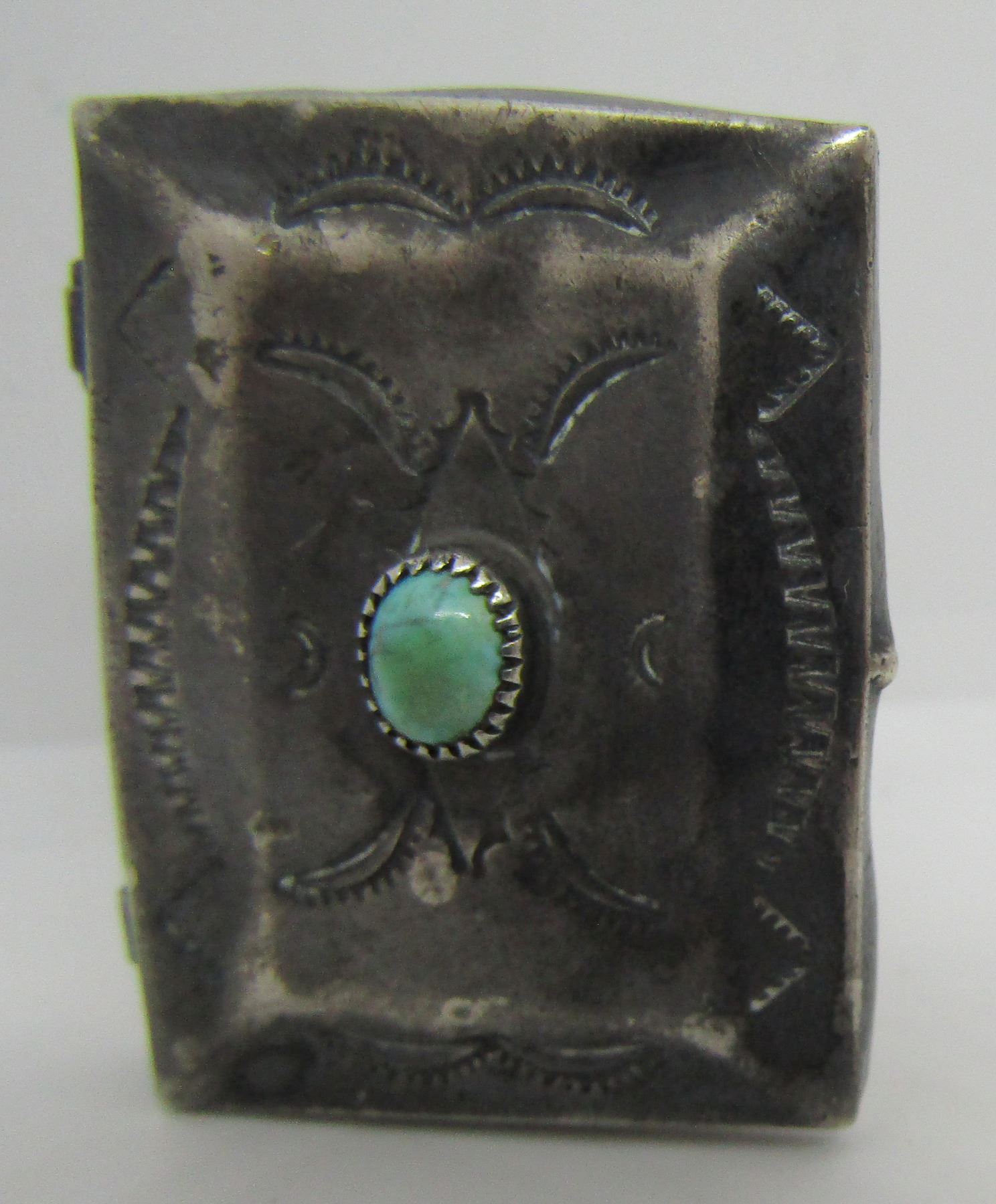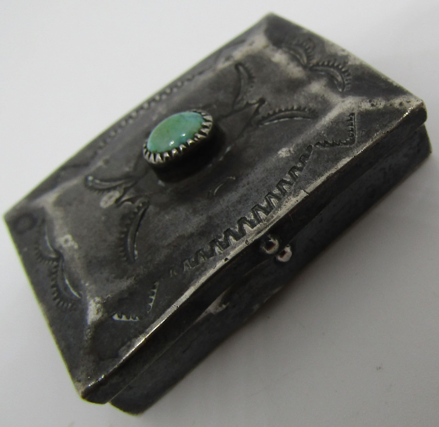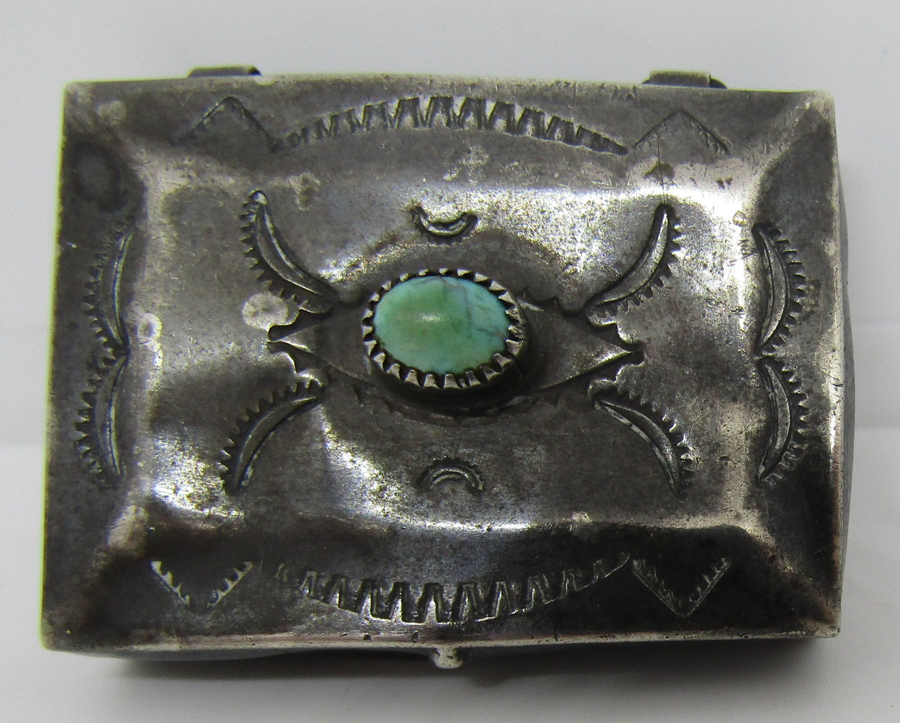 OLD PAWN HAND STAMPED BOX WITH TURQUOISE. UNMARKED TESTED STERLING NATIVE AMERICAN SOUTHWEST INDIAN ACCESSORY. MEASURE 38MM WIDE X 28MM X 8MM. WEIGH 9.3 GRAMS. VINTAGE ESTATE USED CONDITION. MONOGRAMEDC.E. 7-5-75. USA SHIPPING $5.