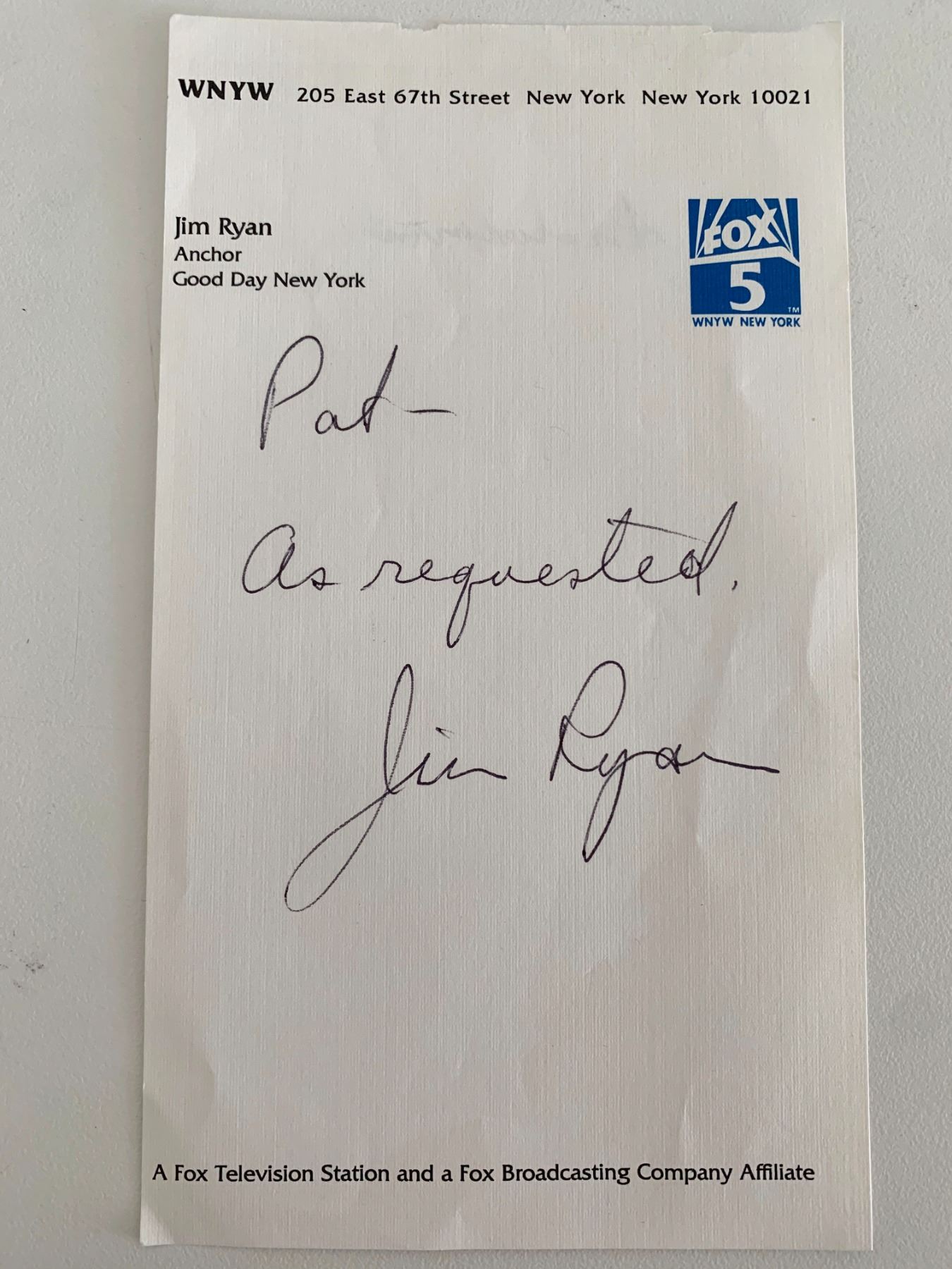 TV Anchor Jim Ryan original signature. 4x7 inches