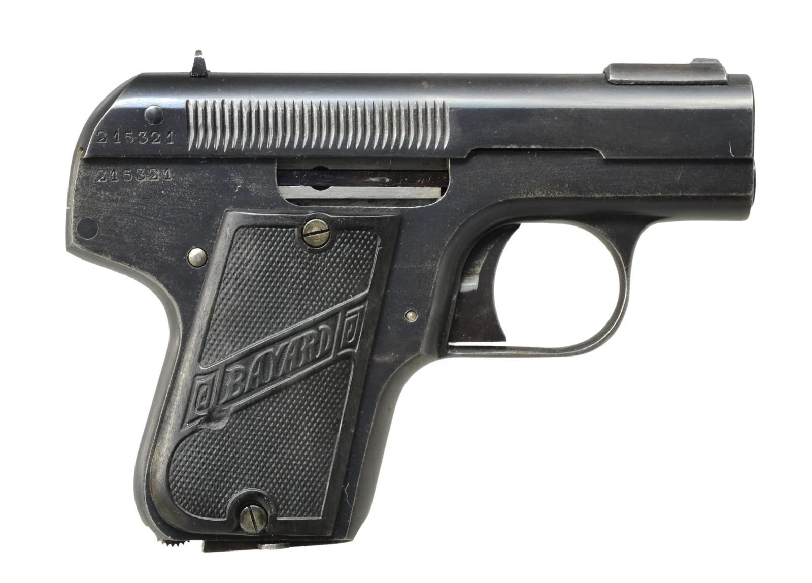 1) JP SAUER M1913. Cal. 32 ACP. S# 158840. Bbl. 3". Blued frame, crowned N proof on right side of frame. Hard rubber grips w/ Sauer logo. "GERMANY" export marked at front of dust cover. MAGS: 1-6 rd. CONDITION: very fine. Over 90% original blue w/ very little high edge wear. Bright shiny bore. Mechanically good. (21-1575/MGM). 2) BAYARD POCKET. Cal. 32 ACP. S# 215321. Bbl. 2 1/4". Actually made by Pieper w/ Bayard marked frame & grips. Blued finish. MAGS: 1 bottom release 6 shot. CONDITION: fine. Bluing w/ sharp edge wears, fading overall. Fine shiny bore. Grips somewhat lifted. Mechanically good. (21-1576/MGM). BOTH CURIO. $500-800.