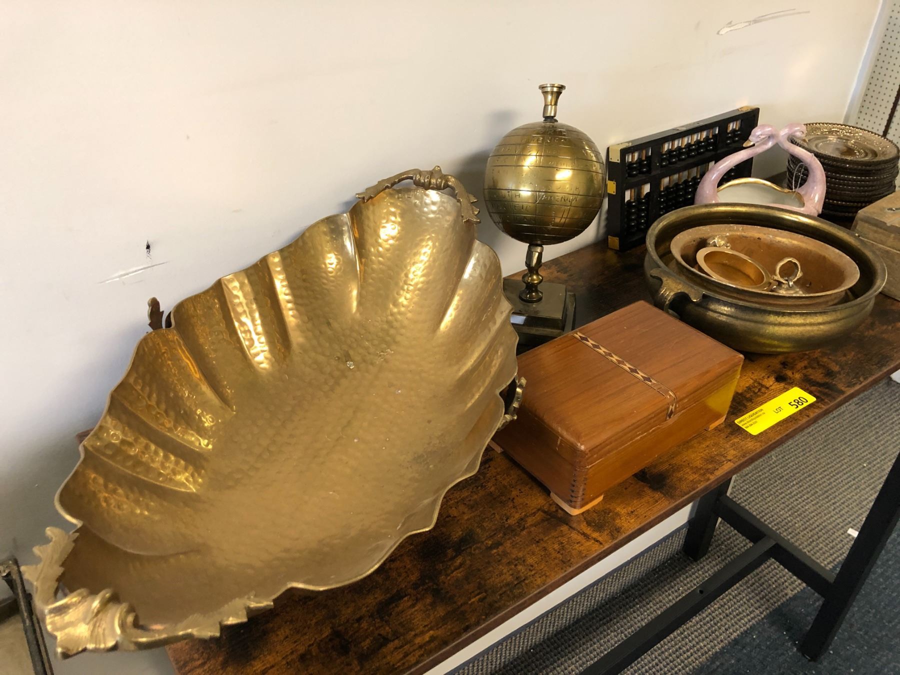 Table Top of Collectibles - Brass Items, Wood Boxes, Brass Globe, Double Swan Bowl and specialty plates