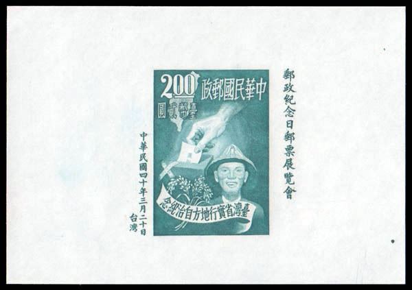 Taiwan, 1951, Self-Government souvenir sheet Scott 1041, pristine, without gum as issued, Very Fine.