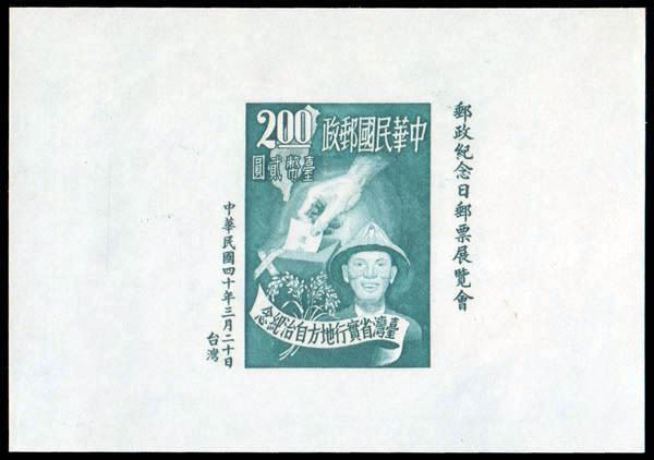 Taiwan, 1951, Self-Government souvenir sheet Scott 1041, a lovely, fresh example on stark white paper, without gum as issued, Very Fine.