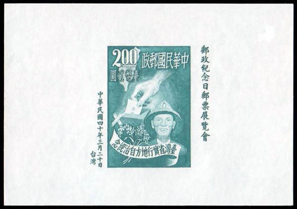 Taiwan, 1951, Self-Government souvenir sheet Scott 1041, fresh on nice white paper, without gum as issued, Very Fine.