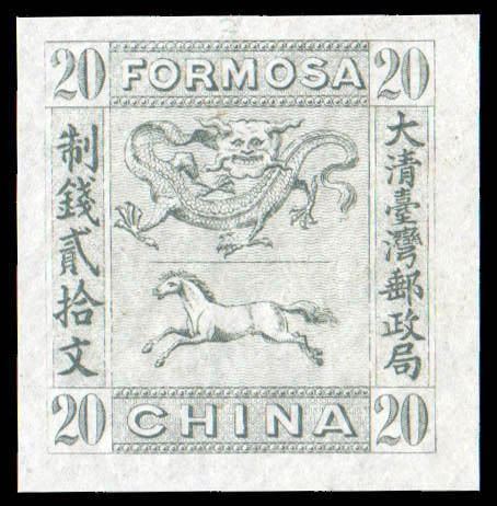 Taiwan: Imperial Province, 1888, Horse and Dragon, 20 cash olive gray trial color proof Chan F15, a splendid medium/thin paper narrow margin Trial Color Proof, 35x35mm; pristine, without gum as issued, Extremely Fine and choice, a beauty.