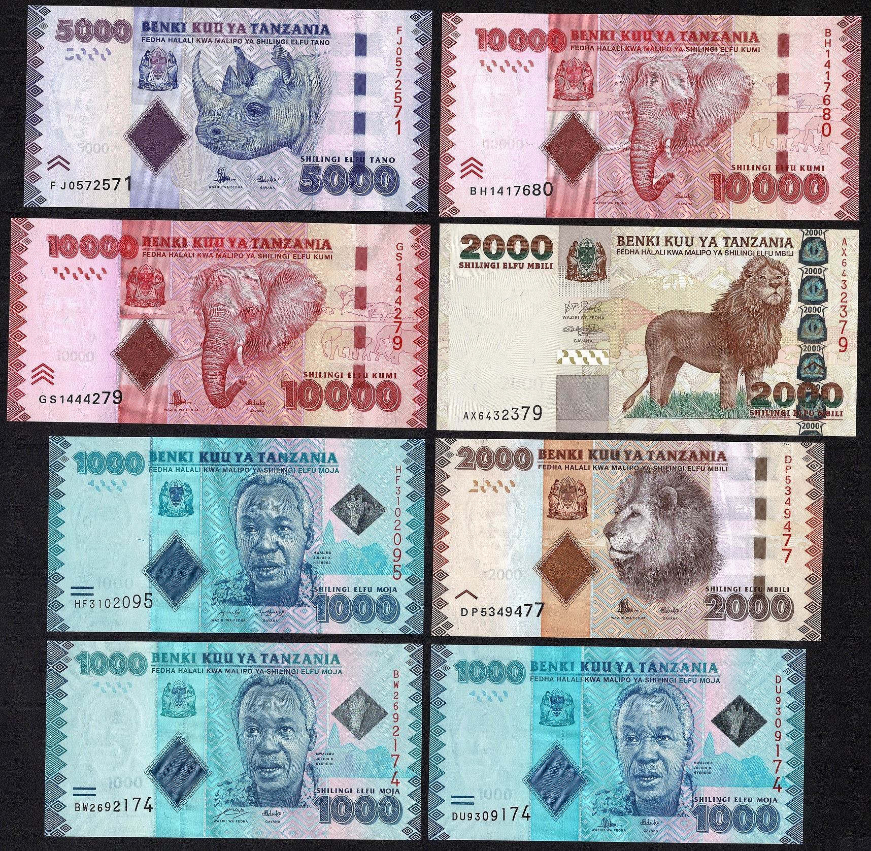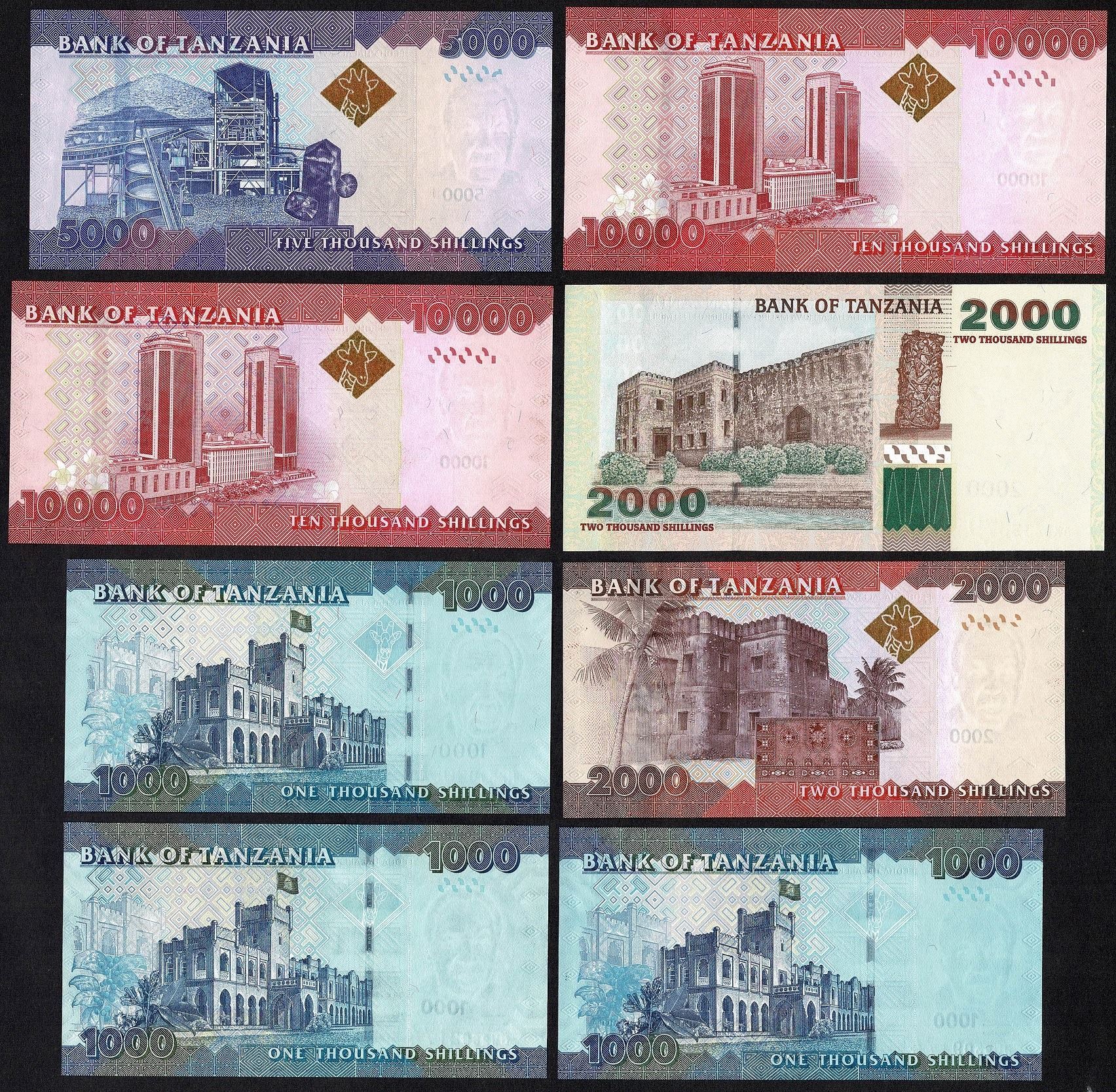 Tanzania 8x 10000 5000 2000 1000 Shilingi 2003 - 2019 Most in UNC quality!