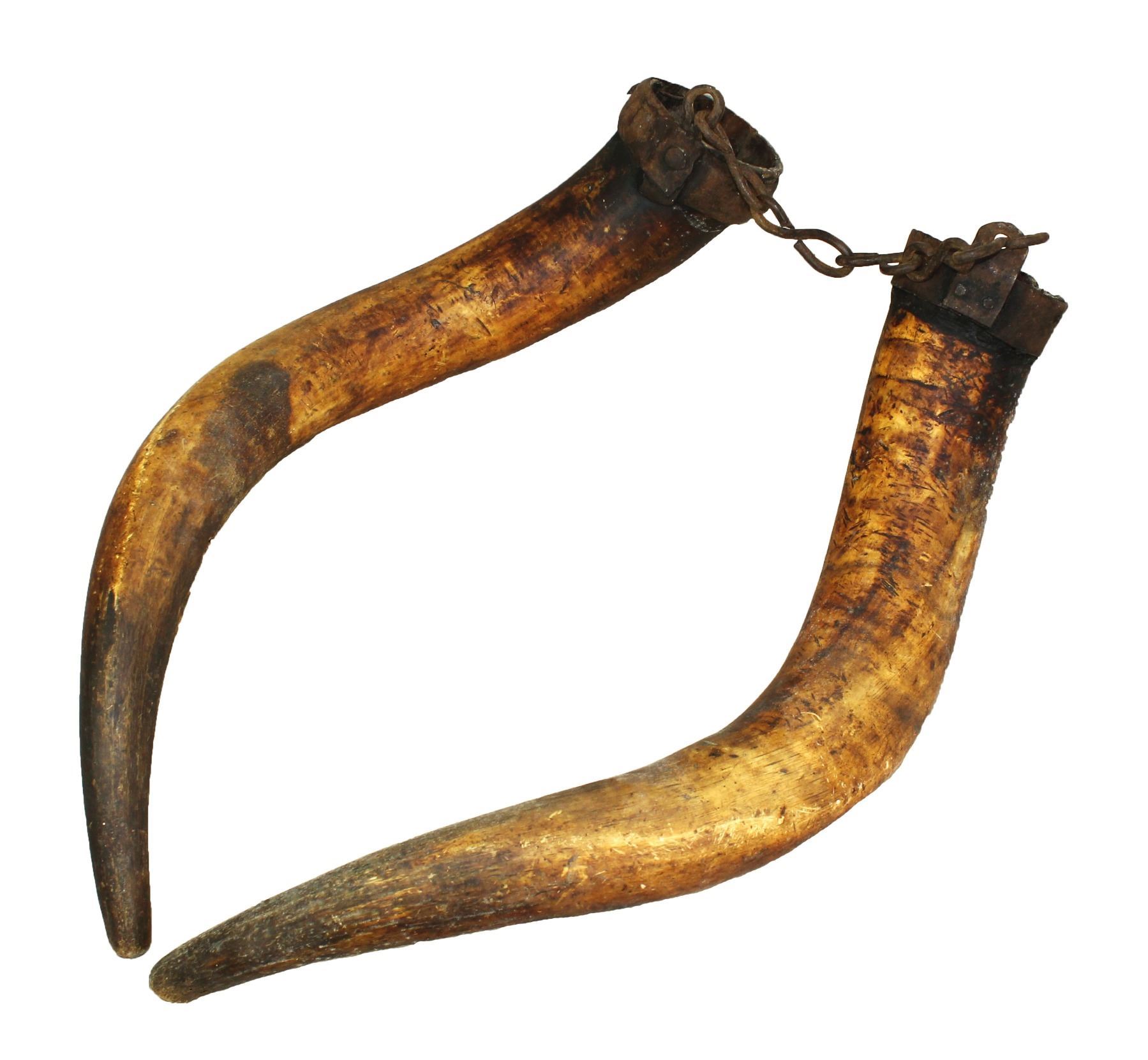 Massive set of very early tar horns measuring 21" in length and connected with hand forged steel and chain. Used to hold axle grease for wagons in the early 1800's on wagon trains going West.