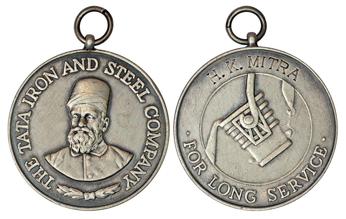 Tata Iron and Steel Company, silver medal, for long service, awarded to H.K. Mitra, 39.90g. Obv: Portrait bust of Jamshedji Tata. Rev: Image of molten steel pouring from a bucket.