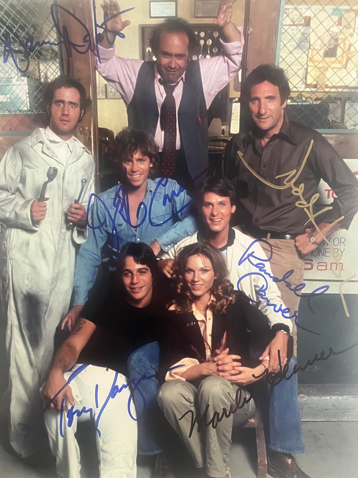 Taxi cast signed photo autographed by Judd Hirsch, Danny DeVito, Marilu Henner, Tony Danza and Randall Carver. 8x10 inches