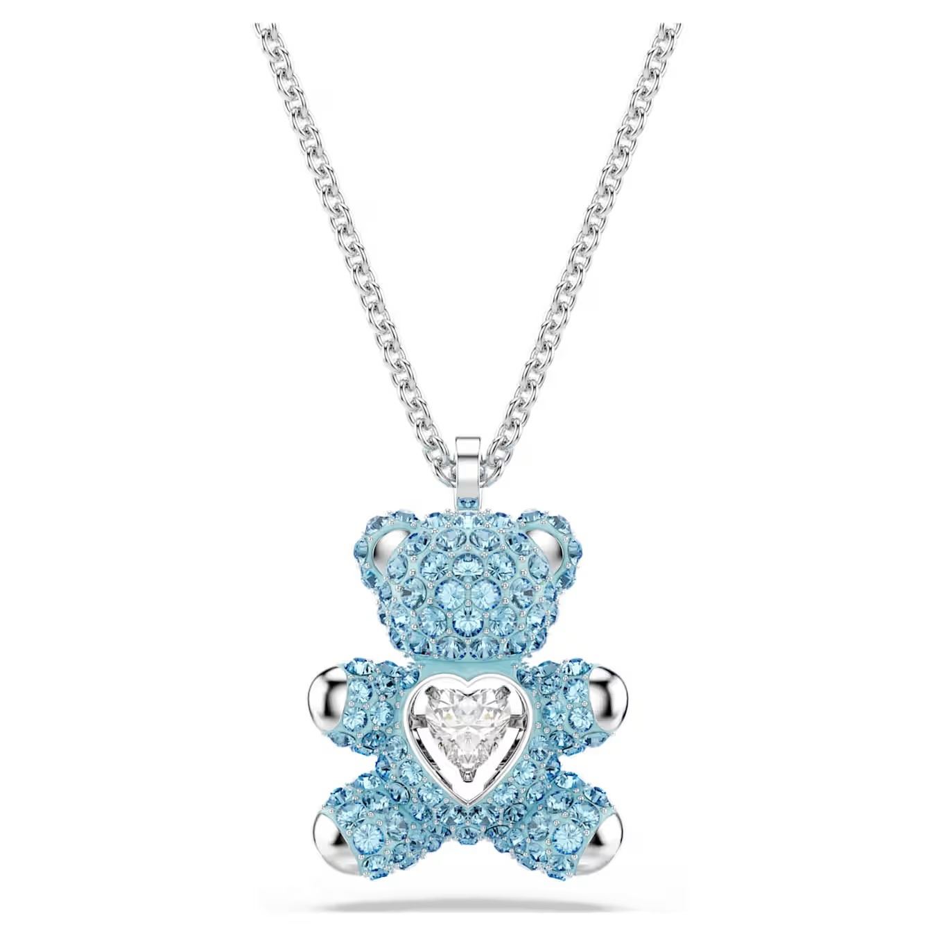 Inspire a smile with this playful pendant. The 3D teddy is covered in blue crystal Pointiage® and holds a heart-shaped dancing stone in a clear tone. Finished with a rhodium plated chain, this unique design encapsulates happiness and love.