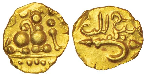 Telugu Chodas of Nellore as feudatories of Nolambas, gold fanam, 'Bhuja' series, (c.1100-1200AD), 0.35g. Obv: stylized representation of a seated Nandi, facing right. Rev: Kannada legend Bhuja above a horizontal Ankusha (elephant goad).