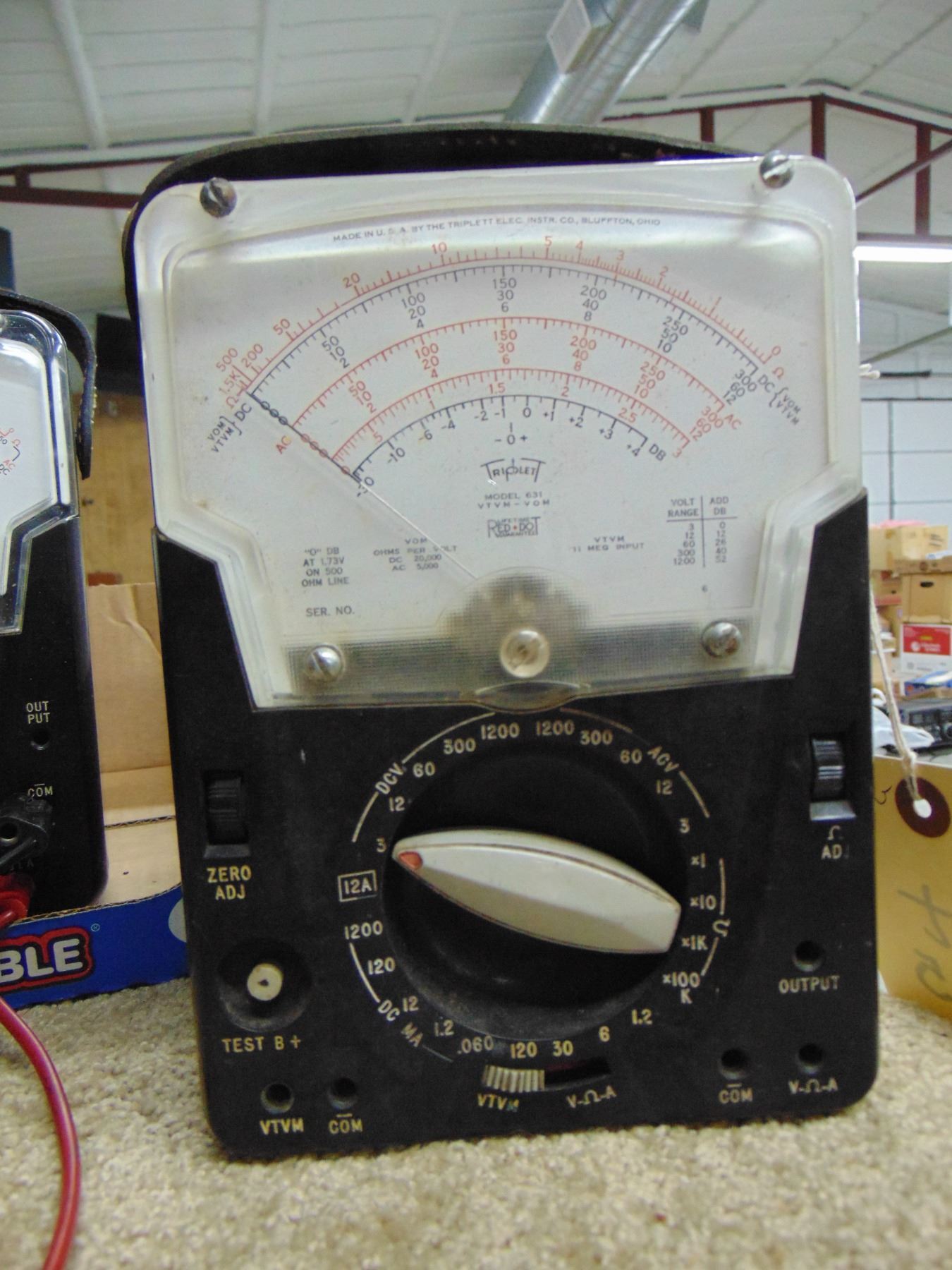 Two Triplett analog volt meters; the one with cables has batteries and does work, model 630. Other, not tested, model 631, VOM/VTVM. Both in good physical condition.