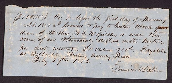 [texas] Edwin Waller - Signer of the Texas Declaration of Independence (1800-1881) Originally from Virginia, he arrived in Texas in April 1831. He was elected on February 1, 1836 as a delegate from Brazoria to the Convention of 1836, which met at Washington-on-the-Brazos and adopted the Texas Declaration of Independence. As a member of the convention, he served on the committee that framed the Constitution of the Republic of Texas. Autograph document signed, 7� x 3� in., Bellville, Austin County, Texas, 27 February 1856. A promissory note for $1,000 to be paid to Gustav Keoch, guardian of Arthur A.E. Kopisch, on or before the first of January 1858. Blue paper is discolored but strongly penned and signed.