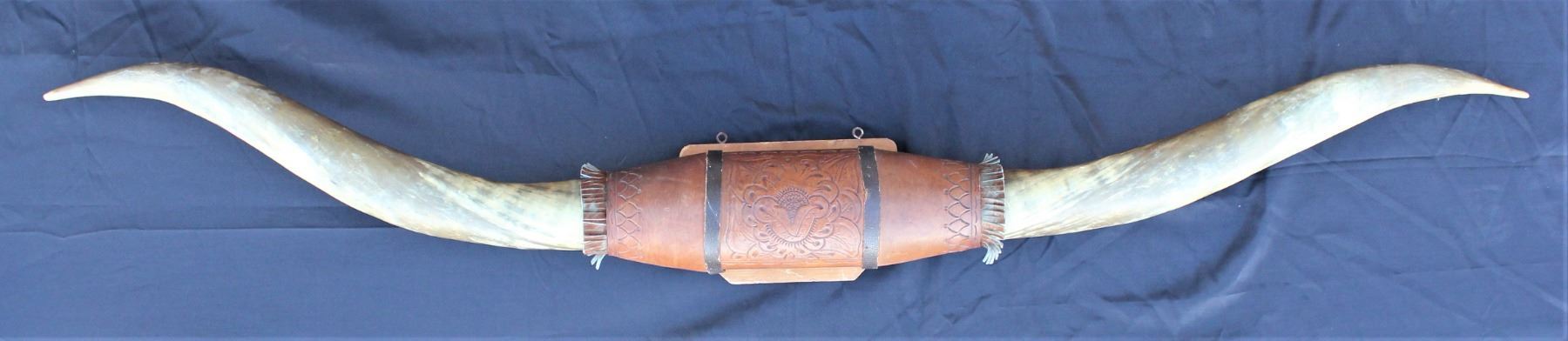 Really nice longhorn mount with tooled leather center wrap, showing appealing patina and measuring 81" in length.