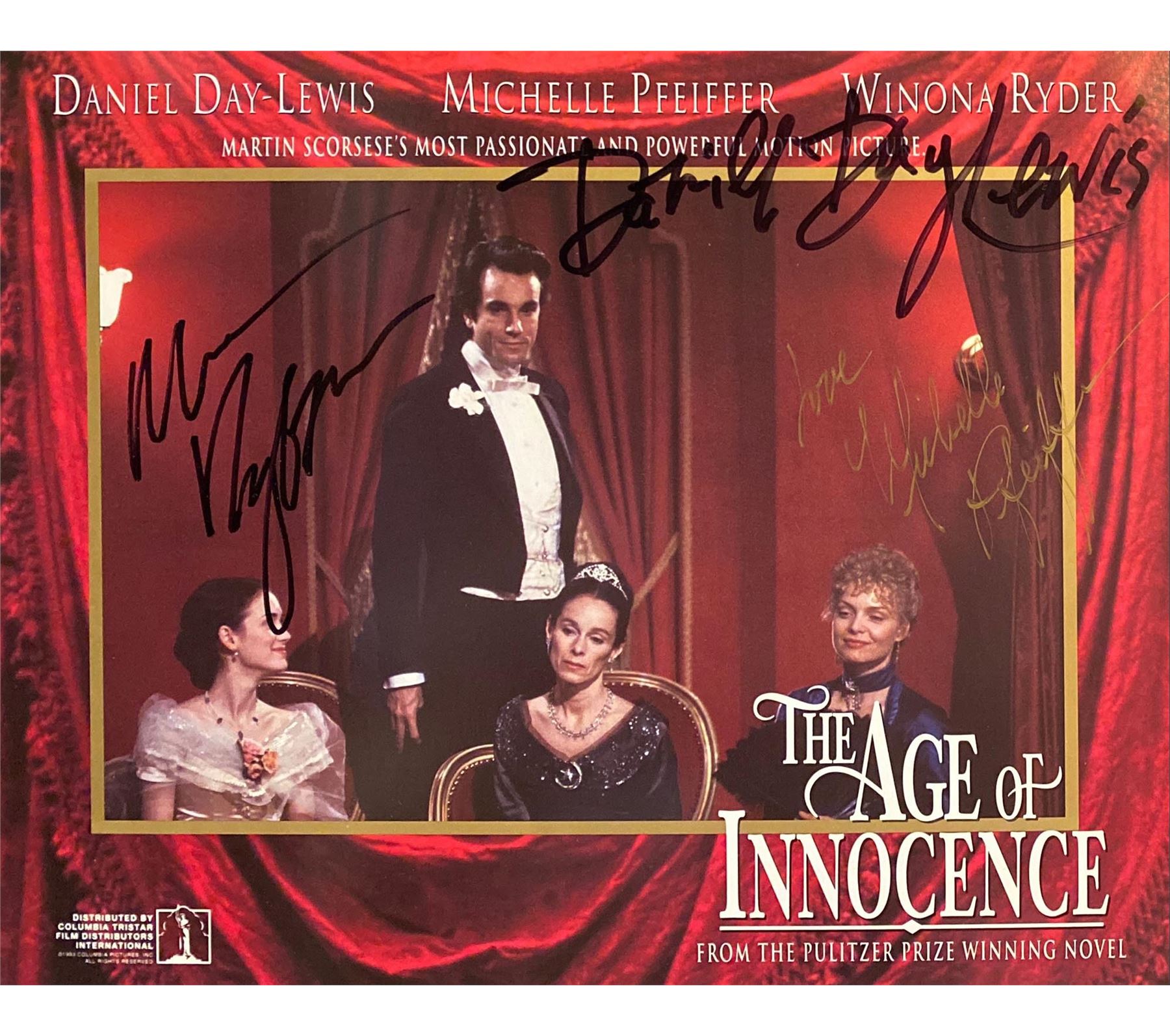 The Age of Innocence signed mini lobby card autographed by Daniel Day-Lewis, Michelle Pfeiffer and Winona Ryder. 8x10 inches