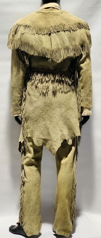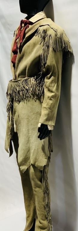 This iconic 6 piece costume consists of a long buckskin coat, a tan brocade vest, a pair of buckskin pants, a creme linen long sleeve pullover shirt, a brown leather belt with fringed buckskin cover and a red linen neck scarf.