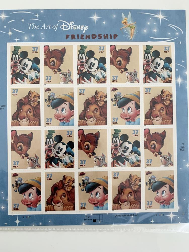 On December 30, 2003 the USPS issued the first of 3 stamp panes honoring the art of Disney. Every good story has heroes and villains, but friends play a part too. From the friendships in Disney films, we've learned how to share, trust, laugh in spite of difficulties, and sometimes, just have fun. The Art of Disney: Friendship stamps feature several world-famous friends: Goofy, Mickey Mouse and Donald Duck; Bambi and Thumper; Simba and his father, Mufasa; and Jiminy Cricket and Pinocchio.