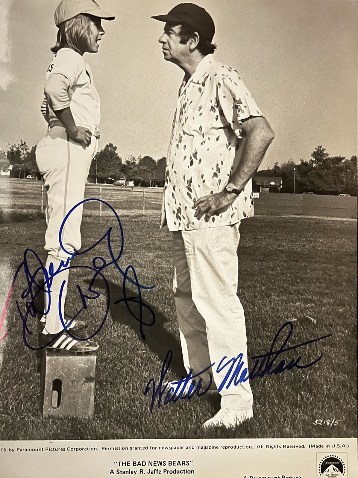 The Bad News Bears signed movie photo autographed by Walter Matthau and Tatum O'Neal. 8x10 inches