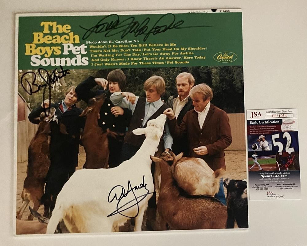 The Beach Boys Pet Sounds signed album autographed by Mike Love, Al Jardine, and Bruce Johnston. JSA authenticated. vinyl included. 12x12 inches