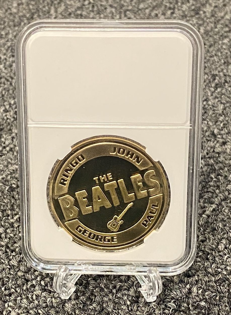 The Beatles Sgt. Pepper's Lonely Hearts Club Band commemorative coin with stand. 2x4 inches
