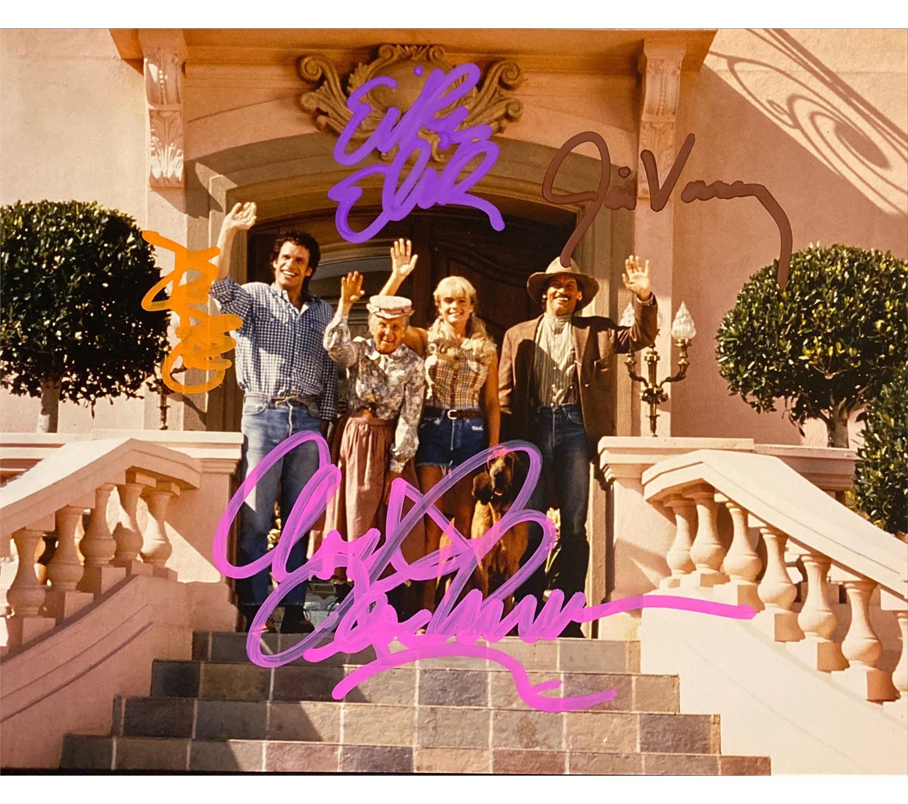 The Beverly Hillbillies cast signed movie photo autographed by Jim Varney, Cloris Leachman, Erika Eleniak, and Diedrich Bader. 8x10 inches