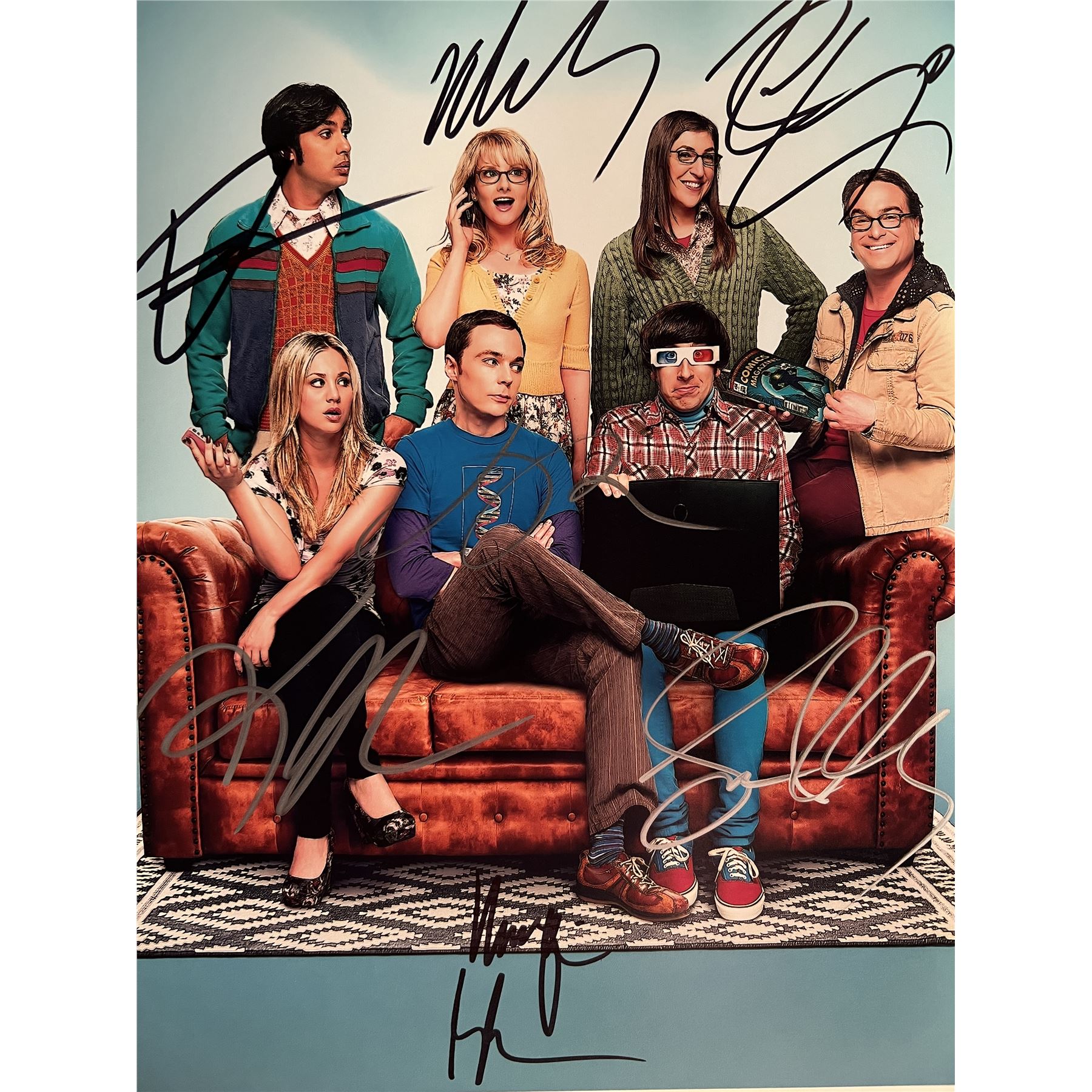 The Big Bang Theory cast signed photo autographed by Johnny Galecki, Jim Parsons, Kaley Cuoco, Simon Helberg, Kunal Nayyar, Mayim Bialik and Melissa Rauch. 8x10 inches