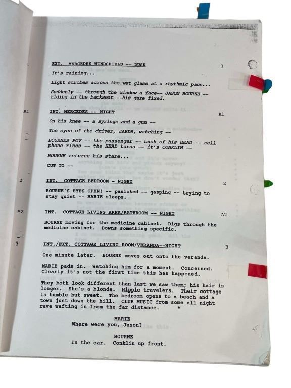 Original script from the production of the Paul Greengrass directed action-thriller film 'The Bourne Supremacy' (2004), which continues the story of Jason Bourne, a former CIA assassin suffering from psychogenic amnesia. Bourne is portrayed by Matt Damon.