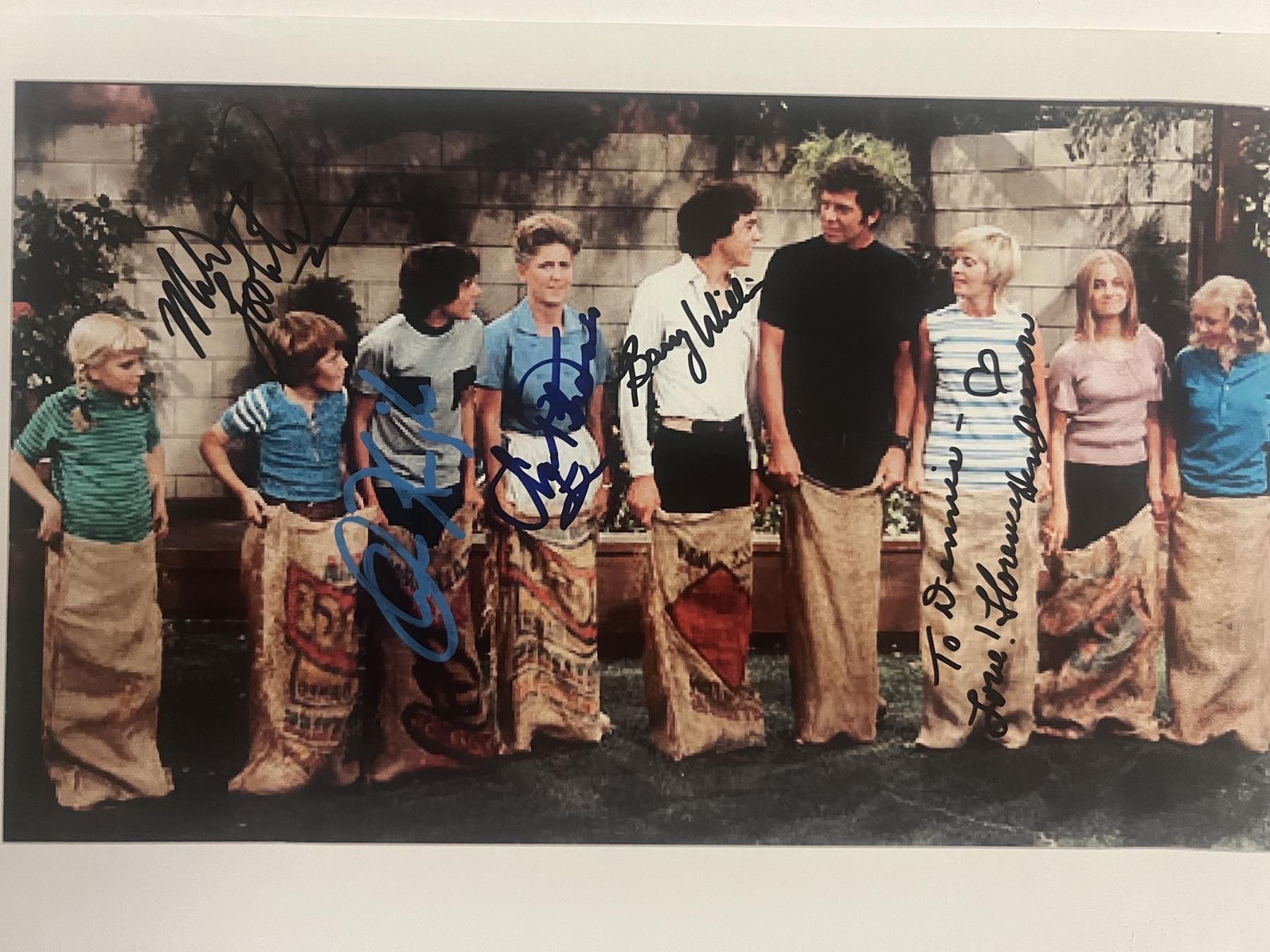 The Brady Bunch cast signed photo autographed by Barry Williams, Florence Henderson, Ann B. Davis, Christopher Knight and Mike Lookinland. 11x8 inches