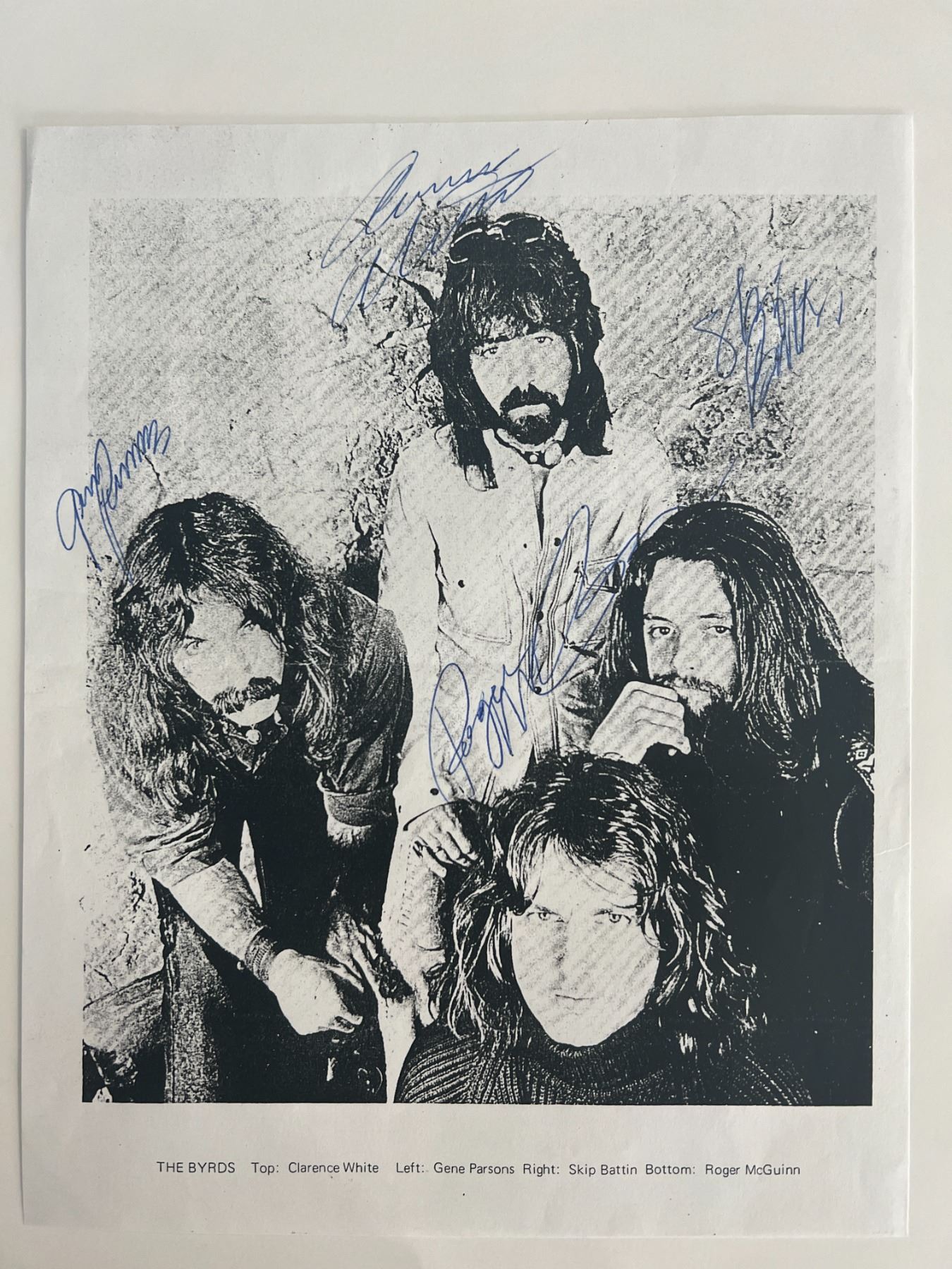 The Byrds signed photo autographed by Clarence White, Gene Parsons, Skip Battin and Roger McGuinn. 8x10 inches