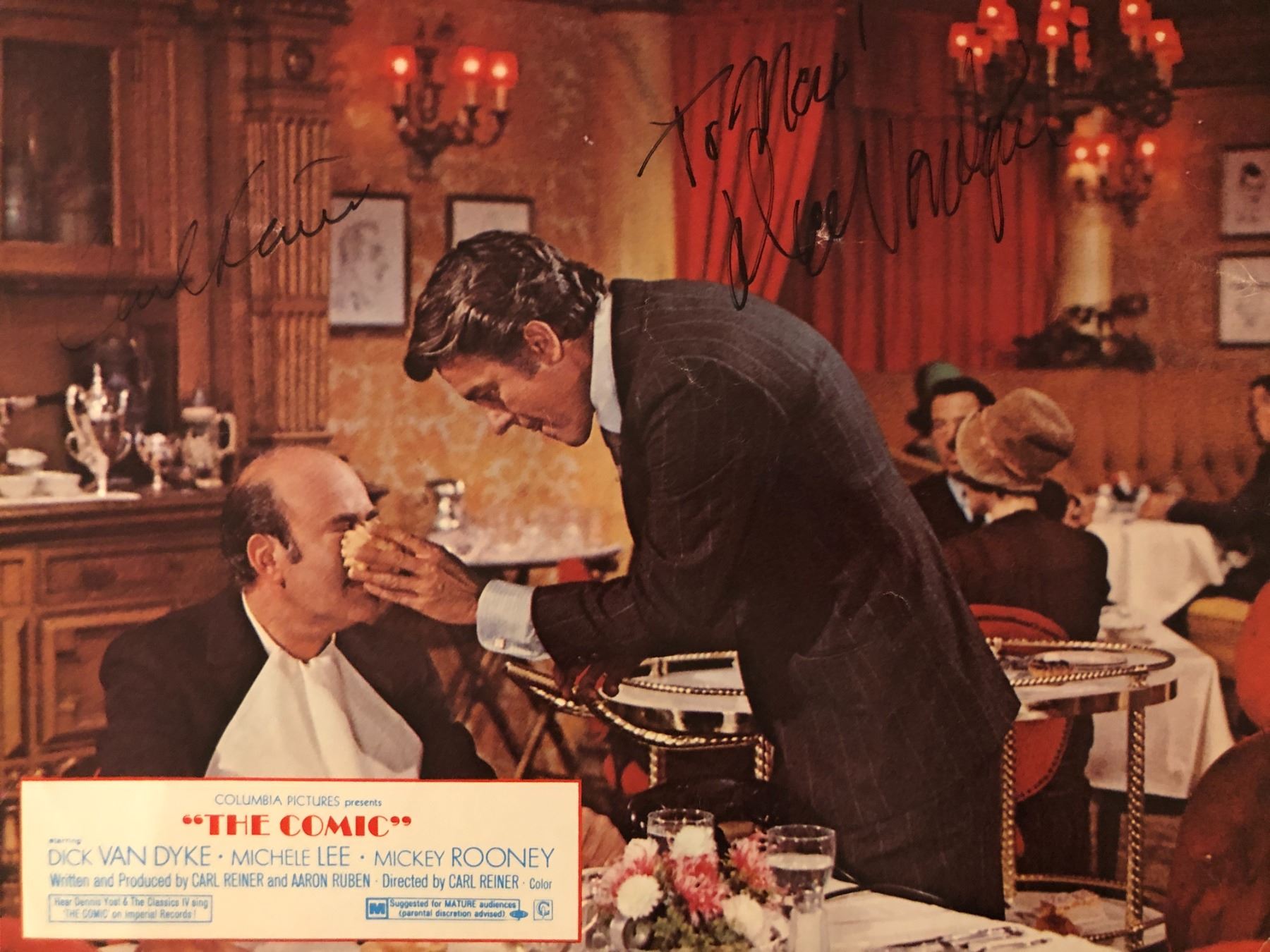 The Comic signed lobby card autographed by Carl Reiner and Dick Van Dyke. 11x14 inches.