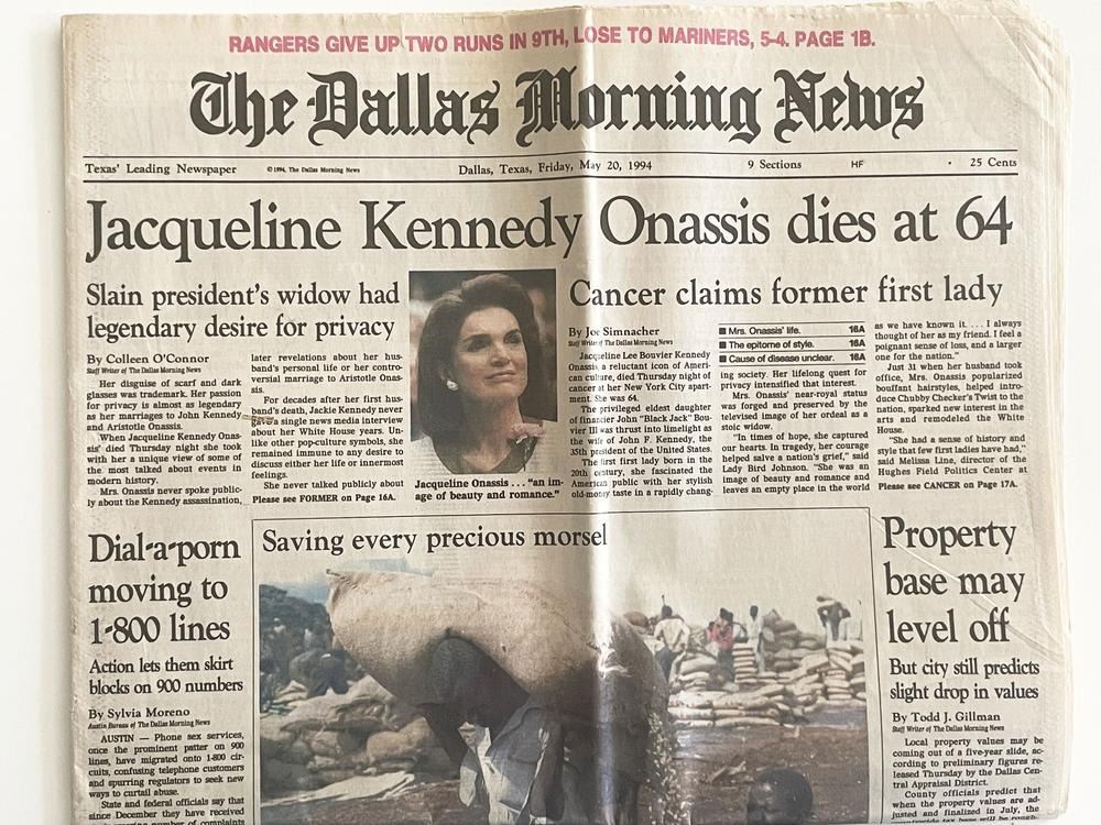 The Dallas Morning News - Jacqueline Onassis Kennedy Dies at 64 - Original Vintage Newspaper - May 20th, 1994. 13x22 inches