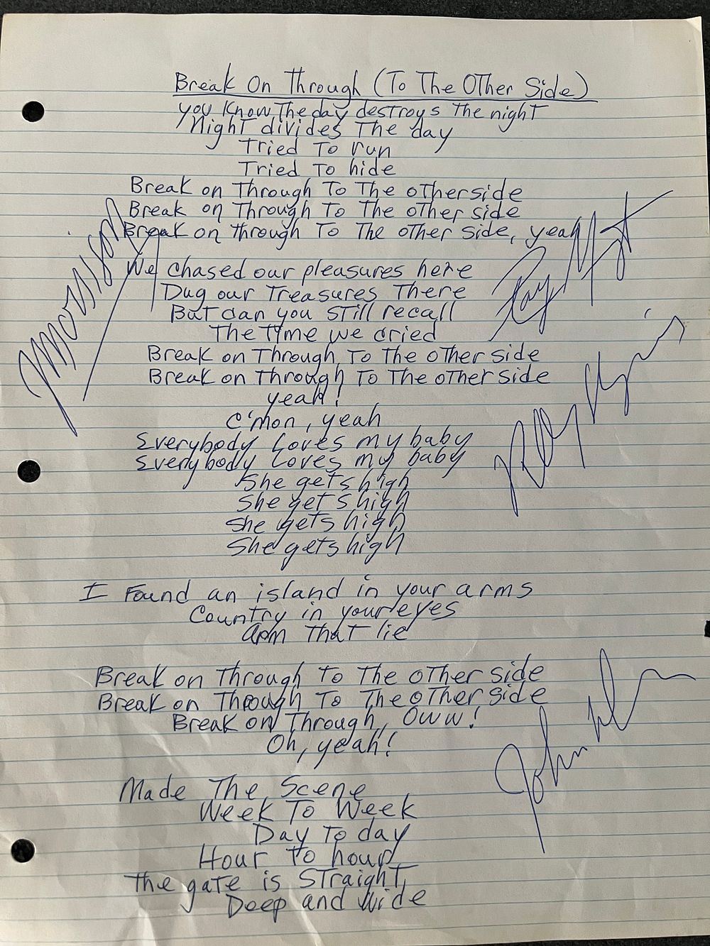 The Doors Band Signed handwritten Break On Through To The Other Side Lyrics autographed by Jim Morrison, Ray Manzarek,Robby Krieger and drummer John Densmore. 8.5 by 11 inches The Doors were an American rock band formed in Los Angeles in 1965, comprising vocalist Jim Morrison, keyboardist Ray Manzarek, guitarist Robby Krieger and drummer John Densmore