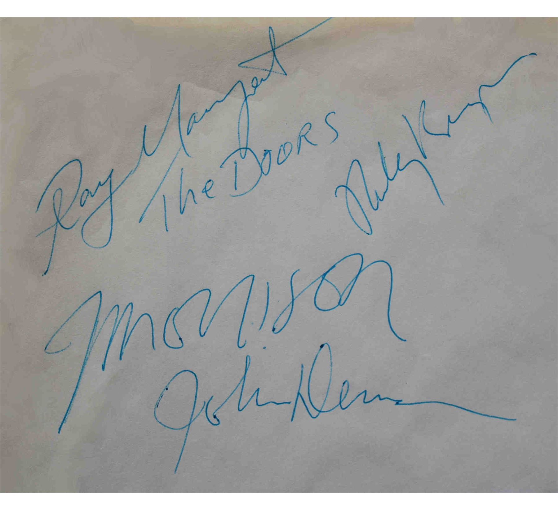 The Doors signature slip signed: Jim Morrison, Ray Manzarek The Doors, Robby Krieger, and John Densmore.