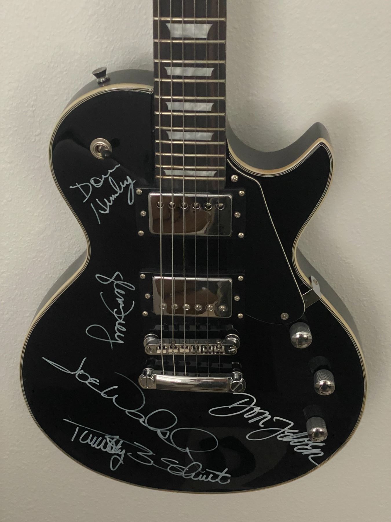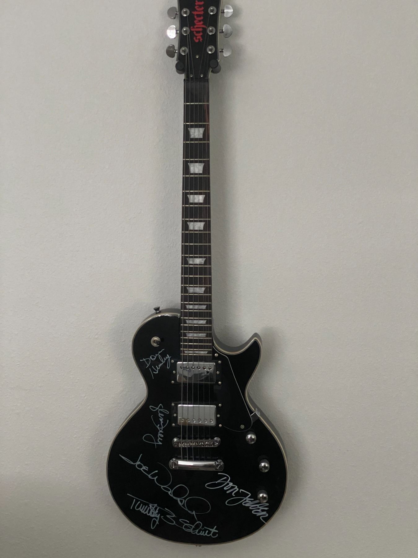 The Eagles band signed Schecter guitar autographed by Don Henley, Glenn Frey, Don Felder, Timothy B. Schmit and Joe Walsh