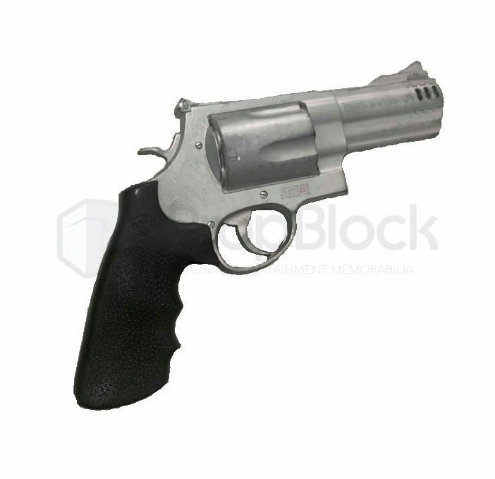 Stunt gun used by the character of Conrad Stonebanks, actor Mel Gibson in the 2014 film Expendables 3. Barney augments his team with new blood for a personal battle: to take down Conrad Stonebanks, the Expendables co-founder and notorious arms trader who is hell bent on wiping out Barney and every single one of his associates. This piece is made of urethane rubber, cast from a real Taurus 5 shot revolver and painted silver with black grips. This piece remains in excellent, production used condition.
