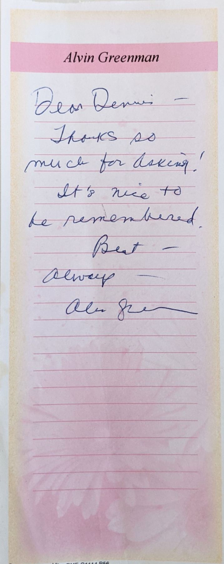 Actor Alvin Greeman signed note. 3x8 inches
