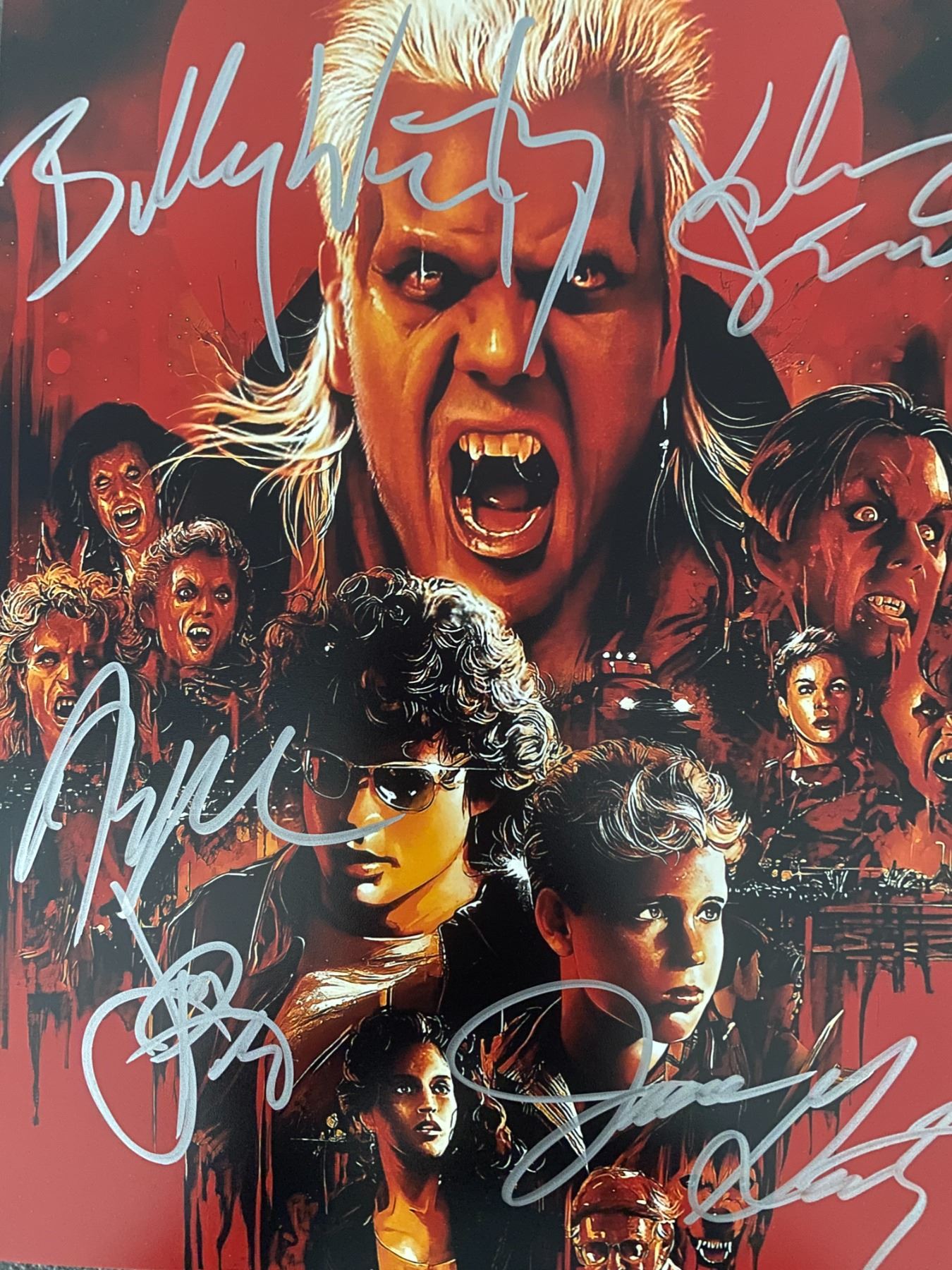 The Lost Boys cast signed movie photo autographed by Billy Wirth, Kiefer Sutherland, Corey Feldman, Jami Gertz and Alex Winter.