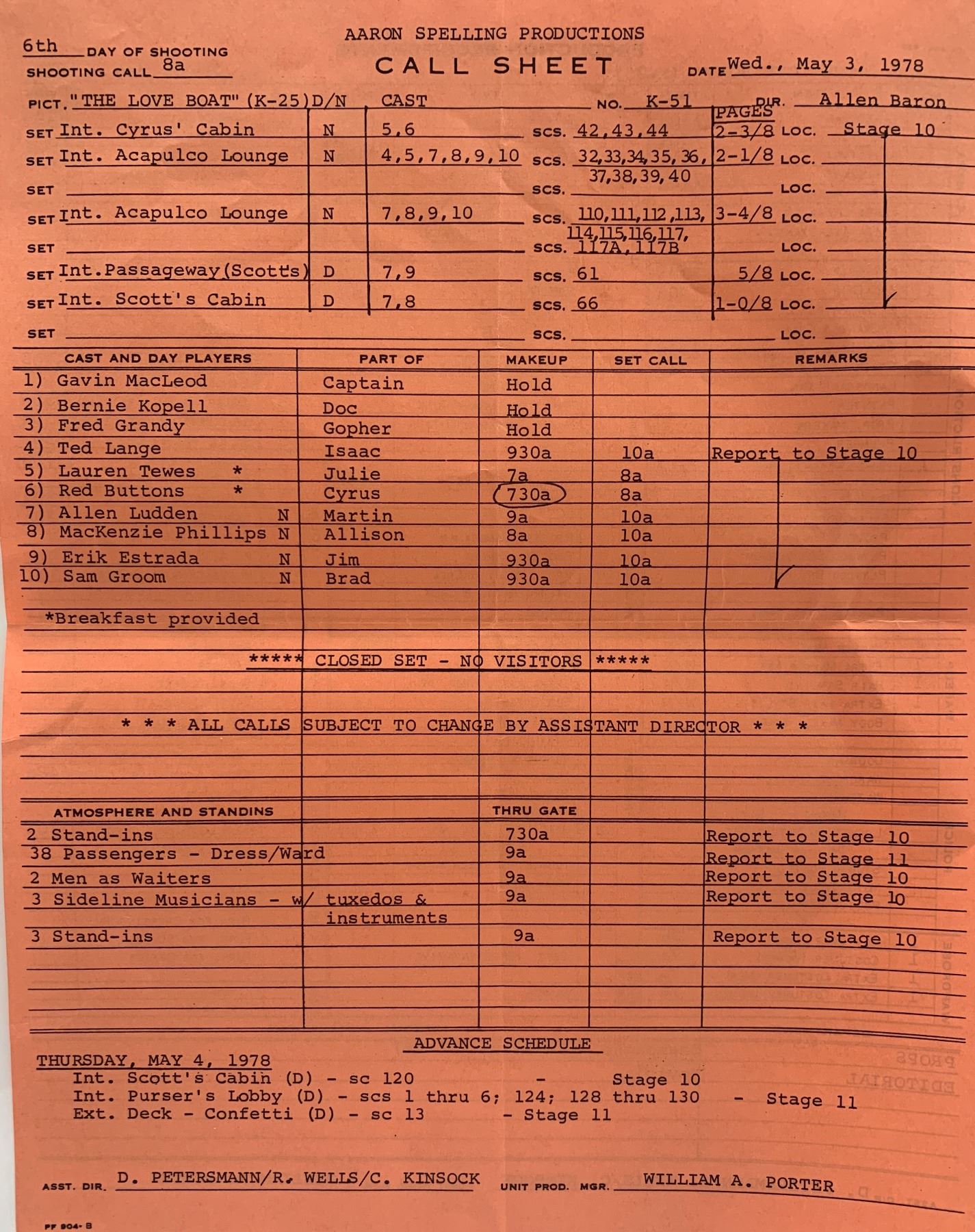 The Love Boat unsigned call sheet