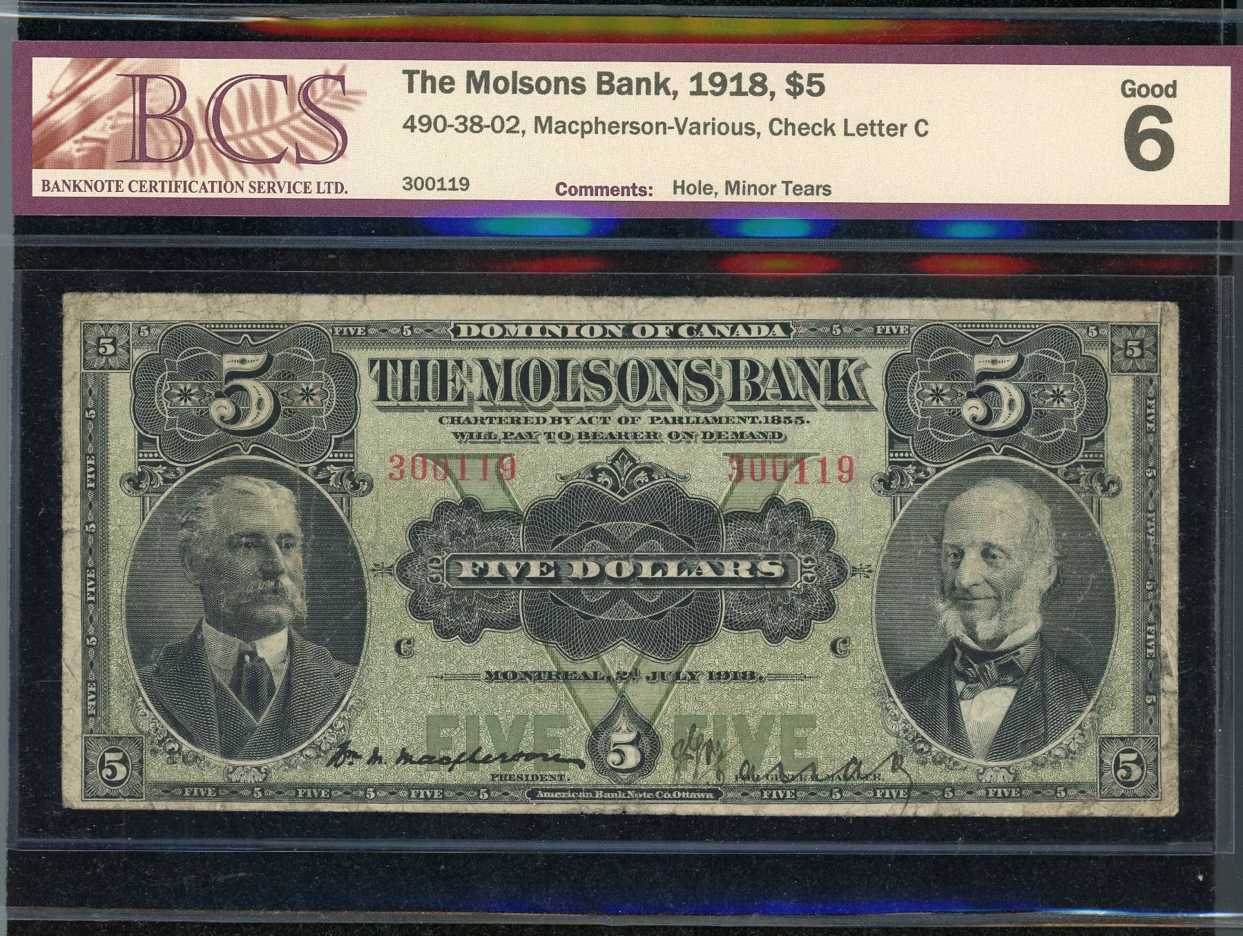 Ch.490-38-02, BCS Good-6, Hole, Minor Tears. S/N: 300119, and a very popular note!