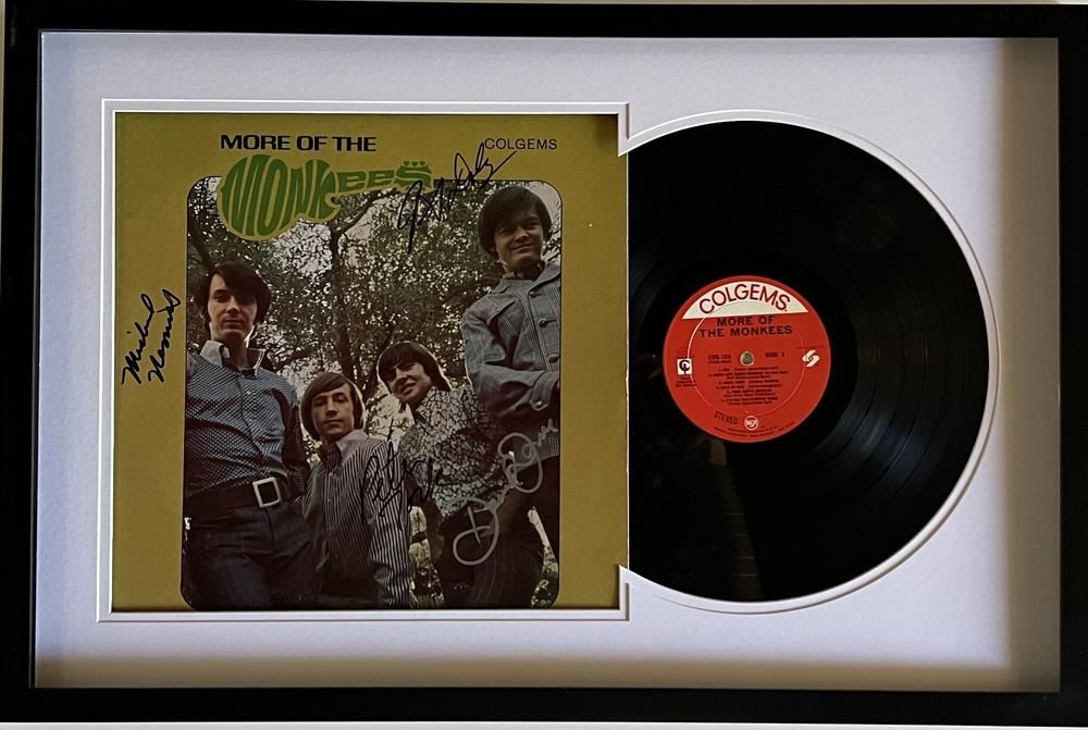 The Monkees 1967 More of the Monkees album. Signed: Davy Jones, Mike Nesmith, Peter Tork & Micky Dolenz. Vinyl included. 12x12 inches