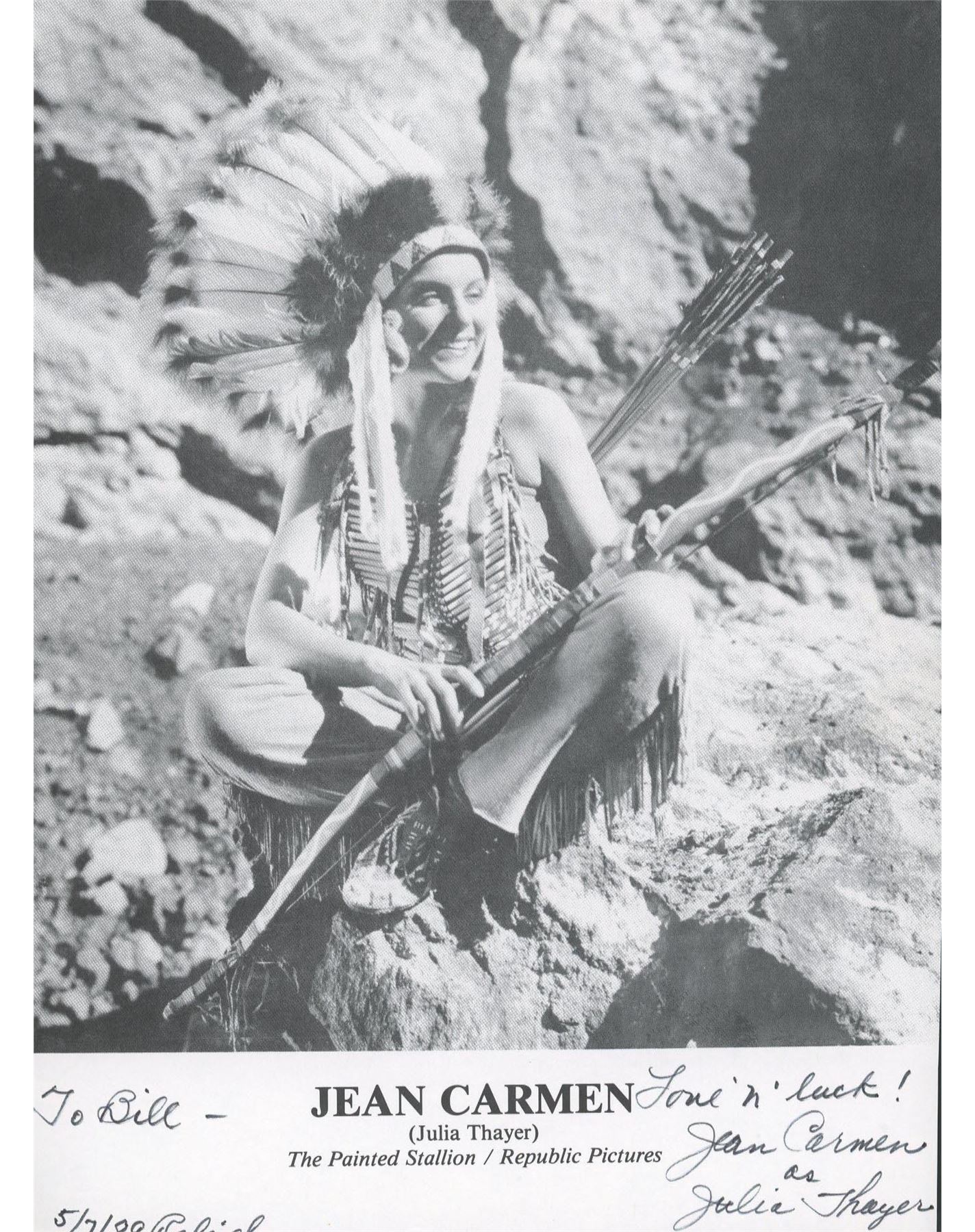 The Painted Stallion black and white 8x10 movie photograph signed by Jean Carmen (Julia Thayer) dated May 7 1989 In Raleigh NC. The verso has a bio of Jean Carmen.