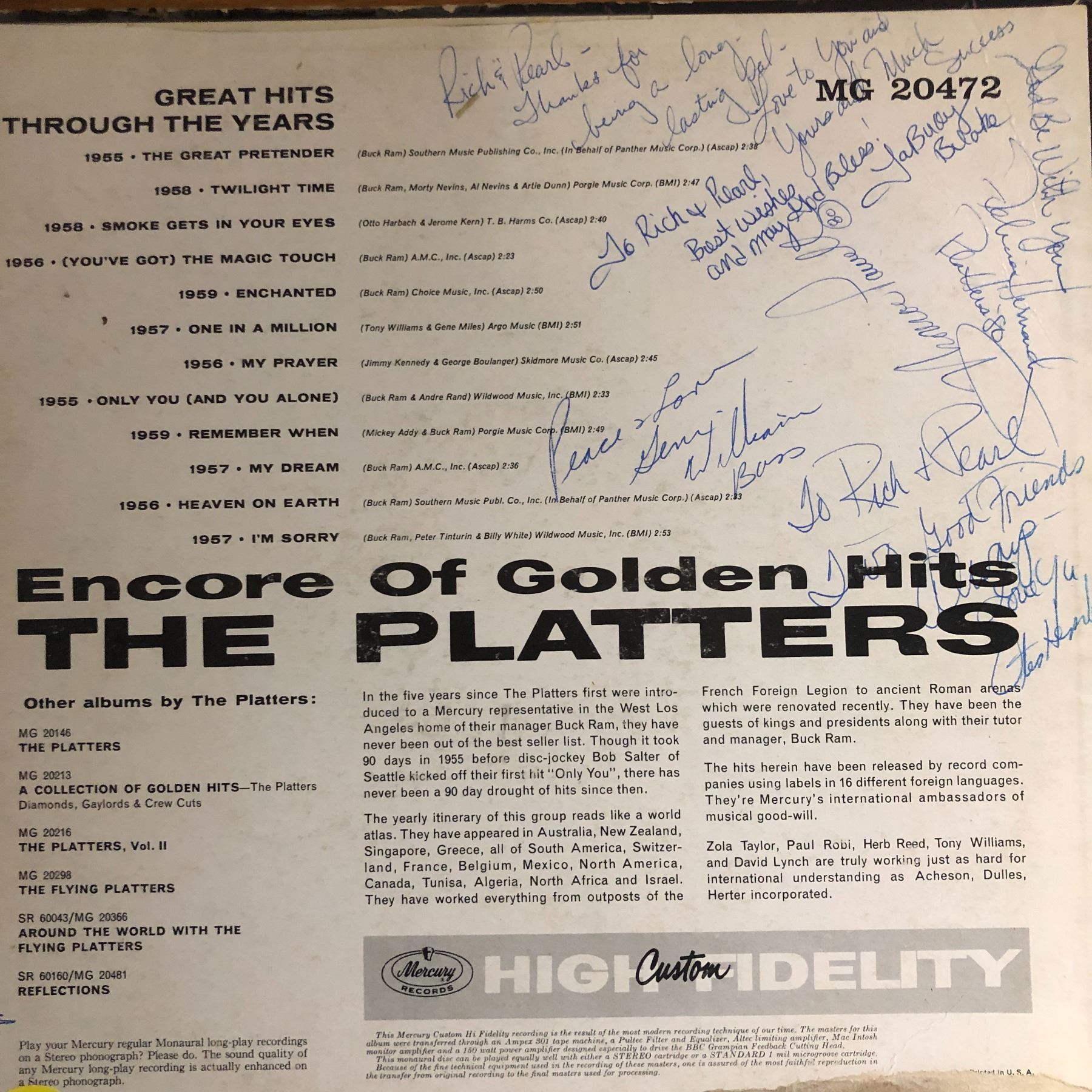 The Platters signed Encore Of Golden Hits album cover autographed by Monroe Powell, John Haynes and Keith Blake. 12x12 inches vinyl NOT included