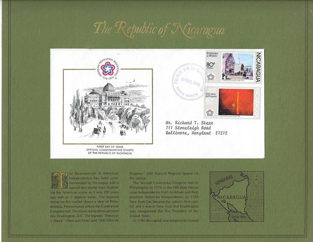 The Republic of Nicaragua - American Bicentennial Commemorative FDC - 25 May 1976 - The Republic of Nicaragua has commemorated the Bicentennial of American Independence with the issuing of a Special Commemorative Stamp on a Limited Edition First Day Cover