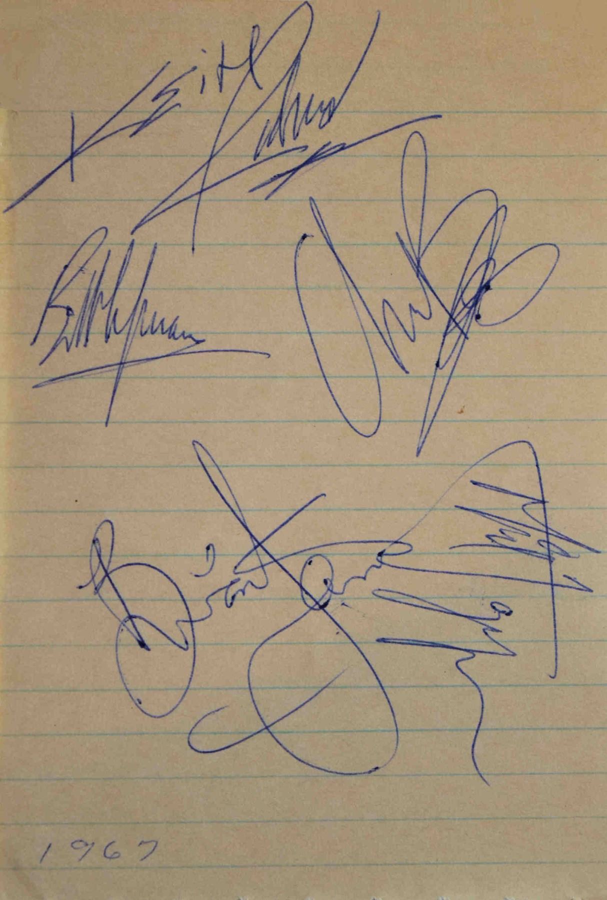 The Rolling Stones 3 3/4 in. by 5 1/2 in. signature slip signed: Keith Richards, Brian Jones, Mick Jagger, Bill Wyman and Charlie Watts